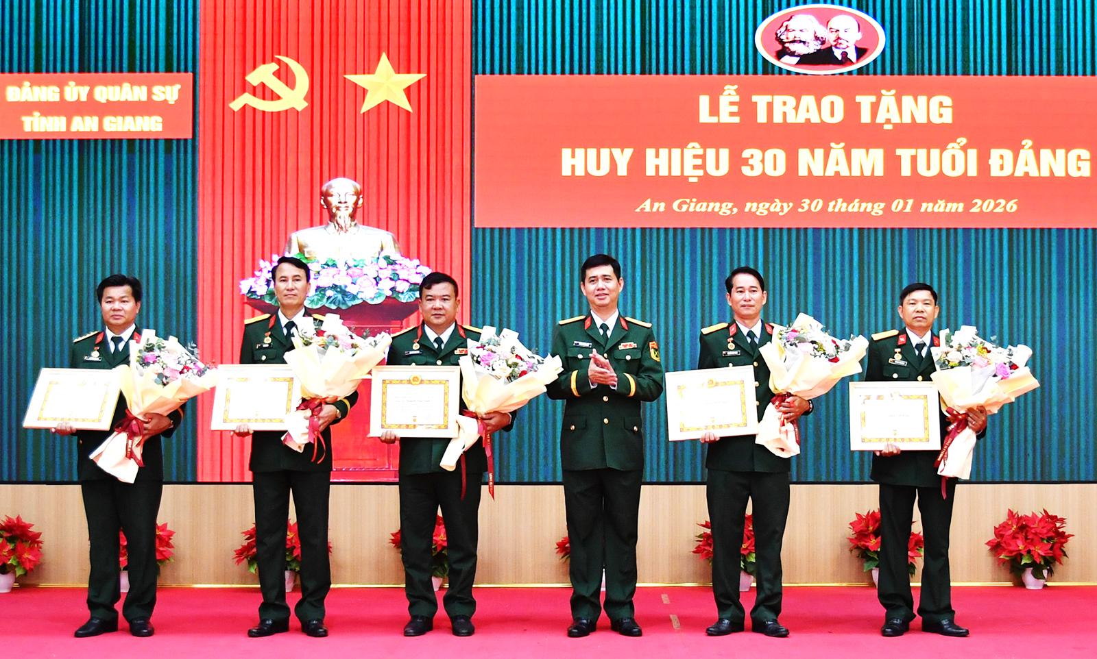 Tại buổi lễ, Ban Thường vụ Đảng ủy Quân sự tỉnh An Giang trao Huy hiệu 30 năm tuổi Đảng cho 5 đảng viên đã có quá trình công tác lâu dài trong lực lượng vũ trang tỉnh.
