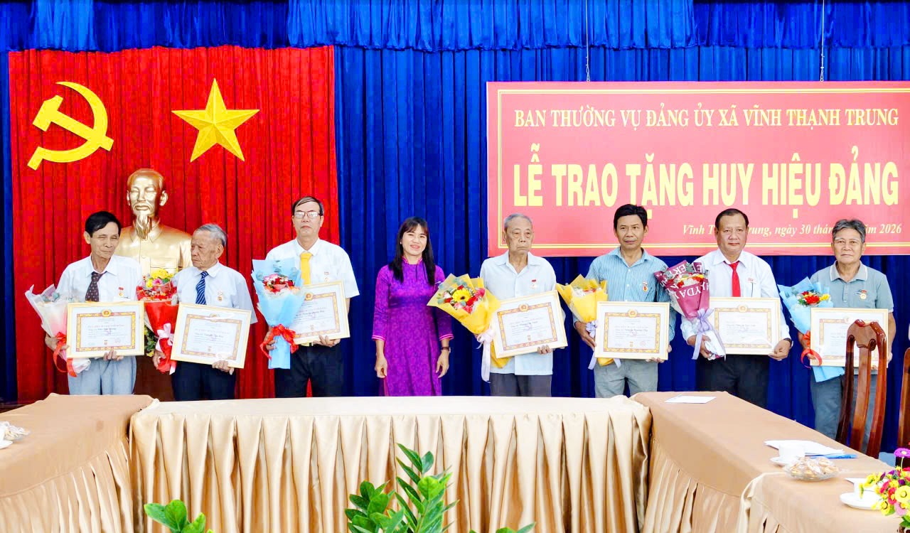Ban Thường vụ Đảng ủy xã Vĩnh Thạnh Trung có 10 đảng viên được trao Huy hiệu Đảng. Trong đó, truy tặng Huy hiệu 65 năm tuổi Đảng cho 1 đảng viên; 1 đảng viên nhận Huy hiệu 55 năm tuổi Đảng; 1 đồng chí 50 năm tuổi Đảng; 2 đồng chí 45 năm tuổi Đảng; 3 đồng chí 40 năm tuổi Đảng và 2 đồng chí 30 năm tuổi Đảng.