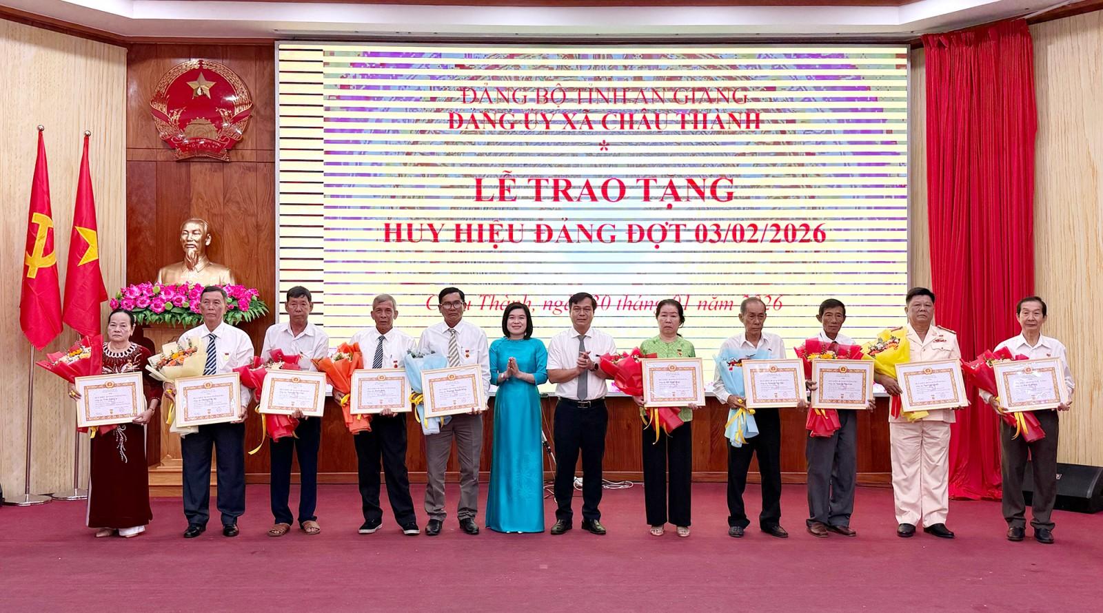 Thường trực Đảng ủy xã Châu Thành trao Huy hiệu 30 năm, 40 năm tuổi Đảng cho các đảng viên.