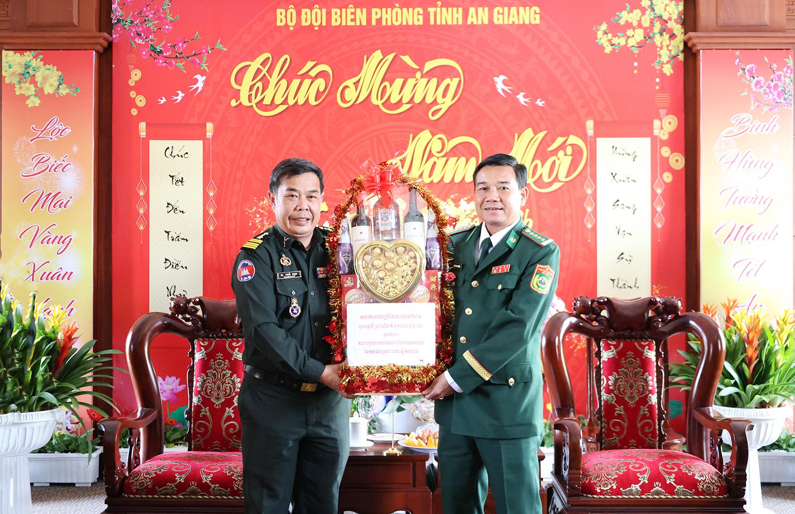 Đại tá Nguyễn Hồng Khiêm, Phó Chỉ huy trưởng Ban Chỉ huy Bộ đội Biên phòng tỉnh An Giang (bên phải) nhận quà chúc mừng năm mới của Hiến binh tỉnh Kandal.