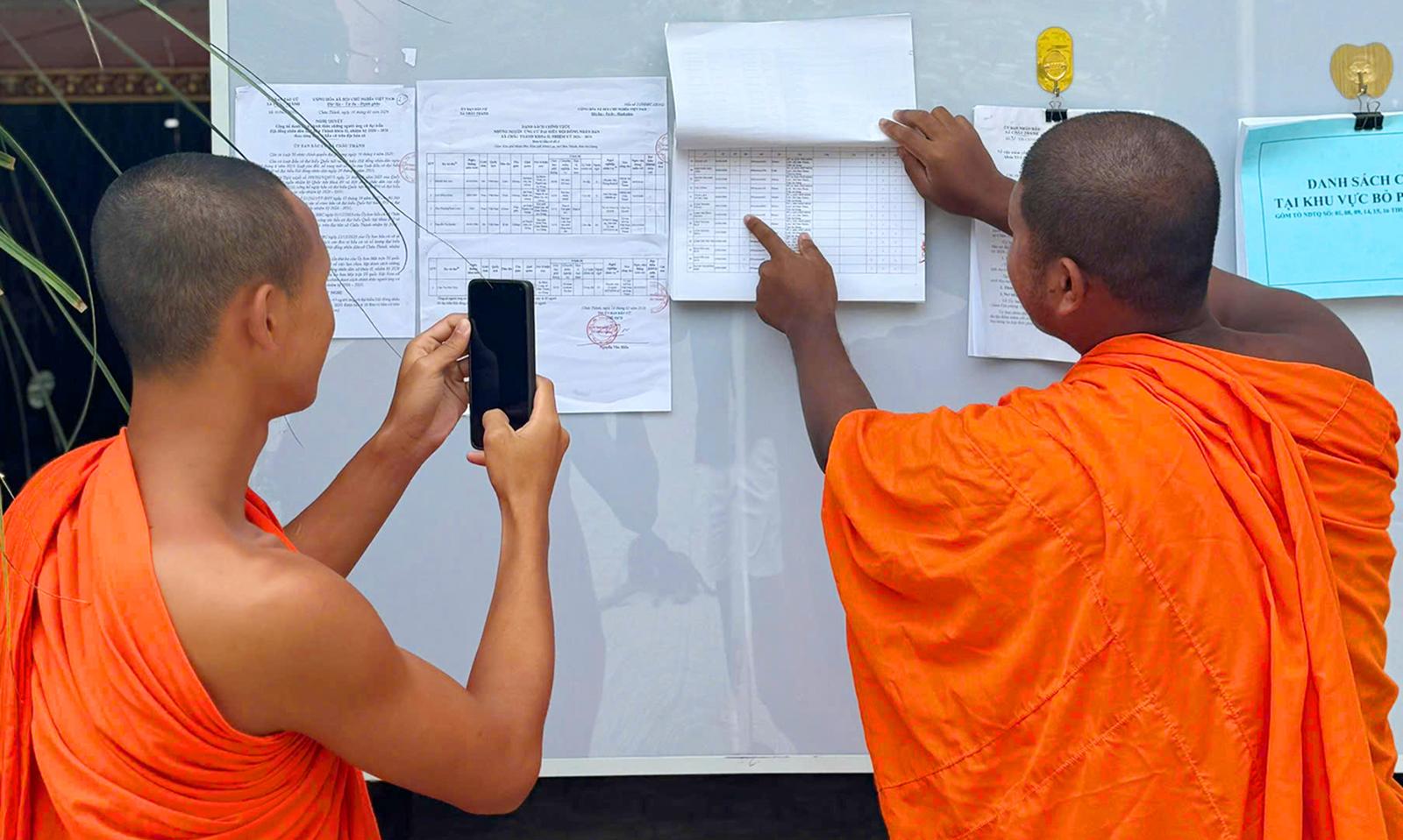 Chư tăng chùa Cù Là Mới, xã Châu Thành xem danh sách thông tin cử tri. Ảnh: DANH THÀNH