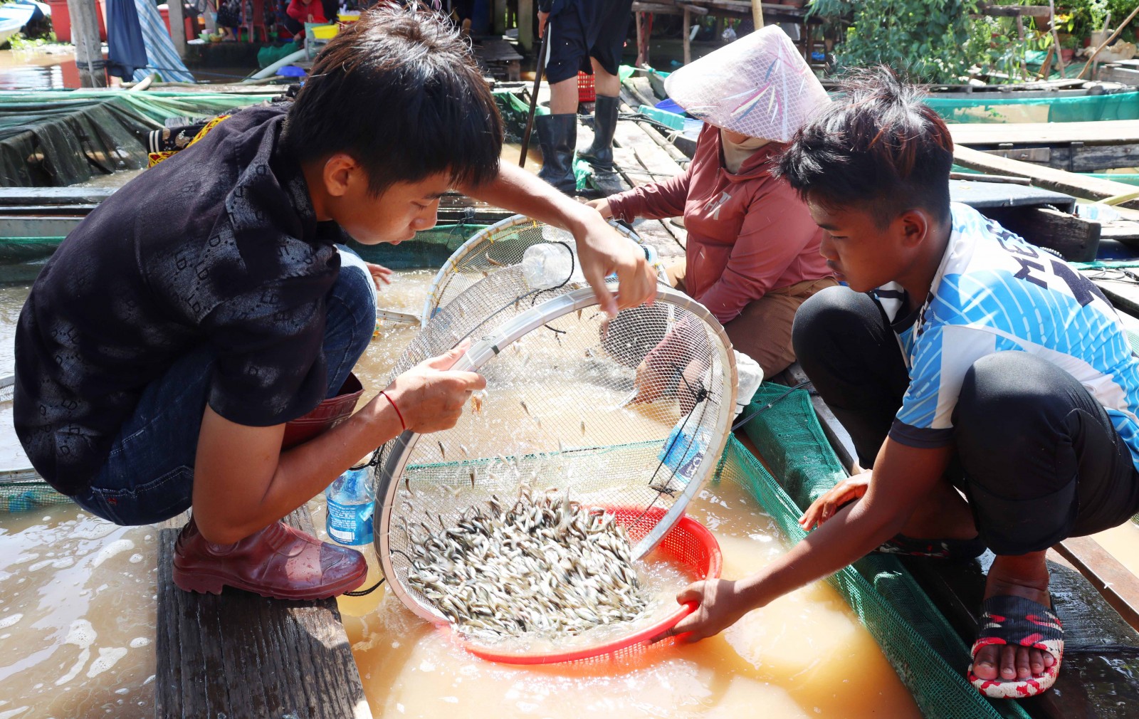 Nước rút, thanh niên phụ gia đình xúc cá linh bán cho tiểu thương, kiếm thêm thu nhập từ 100.000 - 150.000 đồng/ngày. Hiện, cá linh bằng ngón tay cái được tiểu thương thu mua làm mắm bán dịp tết.