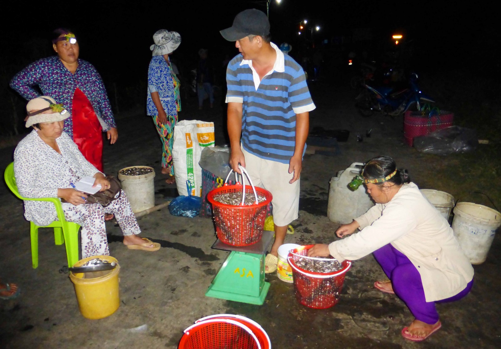 Màn đêm đặc quánh, nhiều hoạt động mua bán cá rôm rả. Cá, tôm tươi rói được tiểu thương phân phối khắp nơi.