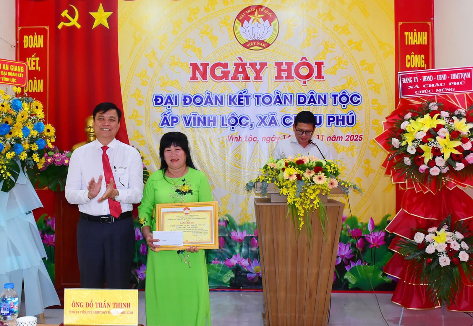 - Chiều 14/11, Phó Chủ tịch Ủy ban MTTQ Việt Nam tỉnh, Chủ tịch Liên đoàn Lao động tỉnh An Giang Đỗ Trần Thịnh đến dự Ngày hội Đại đoàn kết toàn dân tộc ấp Vĩnh Lộc, xã Châu Phú, nhân kỷ niệm 95 năm Ngày thành lập Mặt trận Dân tộc Thống nhất Việt Nam - Ngày truyền thống MTTQ Việt Nam (18/11/1930 - 18/11/2025).