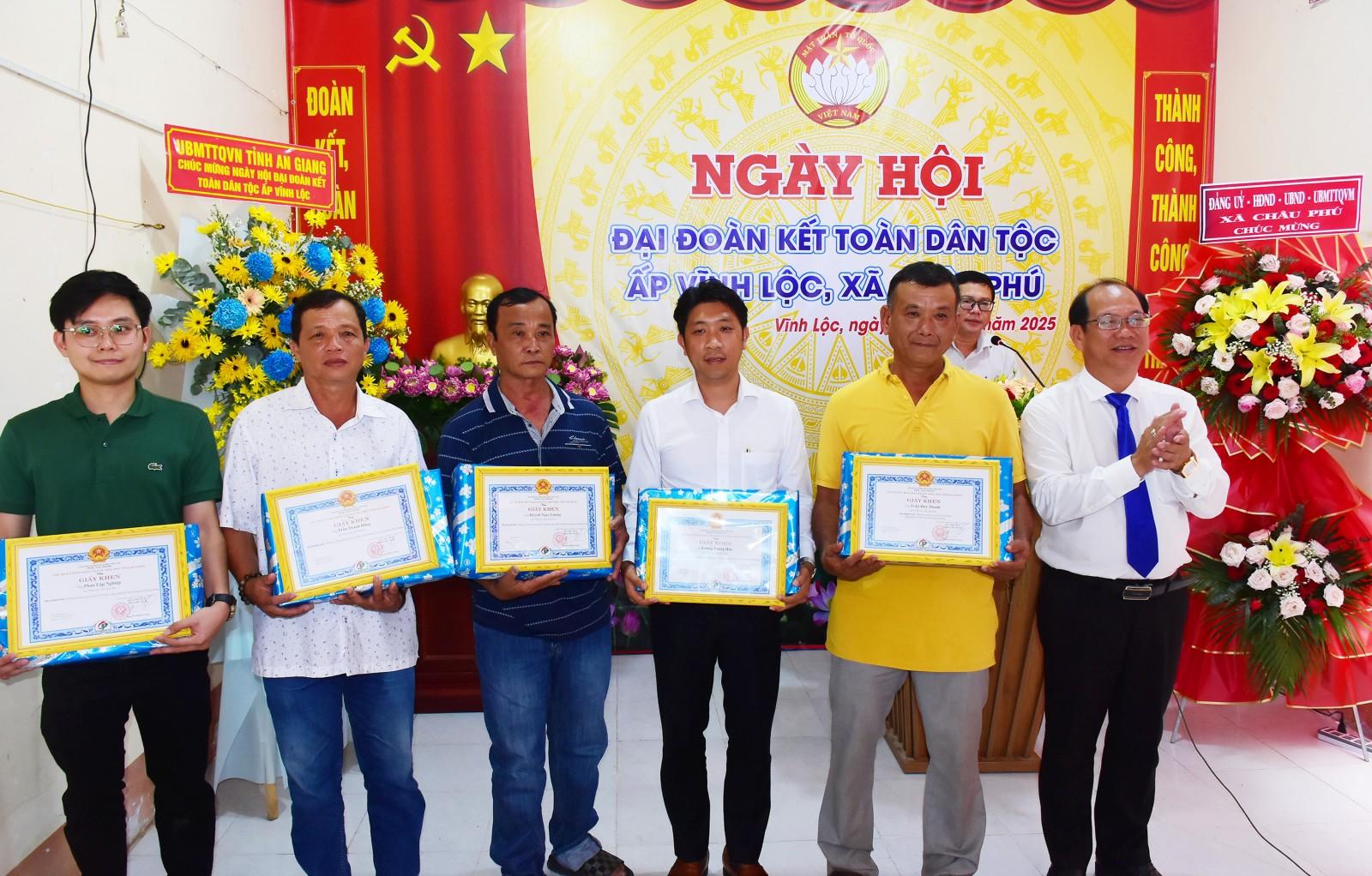 Dịp này, Ủy ban MTTQ Việt Nam tỉnh An Giang tặng bằng khen cho 1 tập thể, 1 cá nhân có thành tích xuất sắc trong thực hiện cuộc vận động “Toàn dân đoàn kết xây dựng nông thôn mới”; UBND xã Châu Phú trao giấy khen cho 5 cá nhân có thành tích xuất sắc trong phong trào thi đua yêu nước năm 2025.
