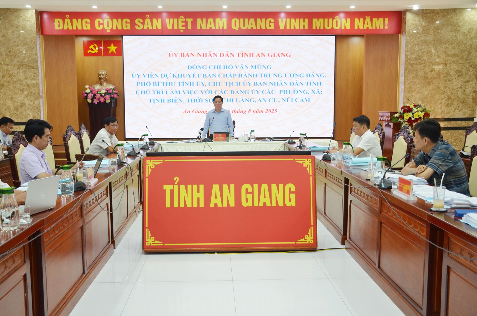 Phát biểu kết luận buổi làm việc, Phó Bí thư Tỉnh ủy, Chủ tịch UBND tỉnh An Giang Hồ Văn Mừng đánh giá cao tinh thần trách nhiệm của Đảng bộ các xã, phường về công tác chuẩn bị đại hội trong bối cảnh vừa mới vận hành chính quyền địa phương 2 cấp. Các xã, phường đã chuẩn bị đầy đủ các nội dung từ xây dựng văn kiện, công tác nhân sự. Đồng thời, hoan nghênh các sở ngành đã tích cực góp ý cho văn kiện đại hội của 5 xã, phường.