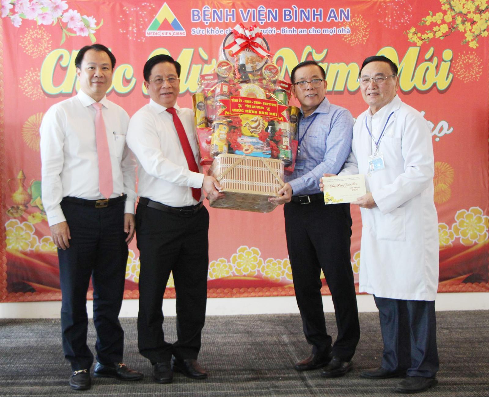 Ủy viên Ban Chấp hành Trung ương Đảng, Phó Bí thư Tỉnh ủy, Chủ tịch UBND tỉnh An Giang Hồ Văn Mừng (thứ hai, từ trái qua) chúc tết, tặng quà Ban Giám đốc Bệnh viện Bình An.