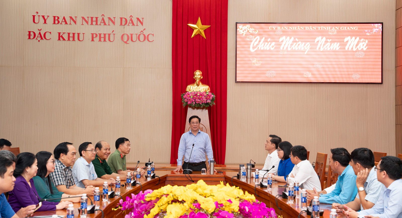 Đến thăm, chúc Tết tại đặc khu Phú Quốc, Chủ tịch UBND tỉnh An Giang Hồ Văn Mừng biểu dương những cố gắng, thành tích, kết quả mà Đảng bộ, chính quyền và Nhân dân đặc khu Phú Quốc đã đạt được trong năm 2025.