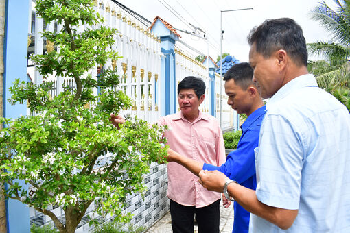 Thời gian qua, các đảng viên Chi bộ ấp Phú Lâm, xã Đông Thái phát huy vai trò gương mẫu, góp sức xây dựng quê hương ngày càng đổi mới, văn minh. Trong ảnh: Đảng viên Chi bộ ấp Phú Lâm vận động người dân xây dựng tuyến đường hoa. Ảnh: BẢO TRÂN