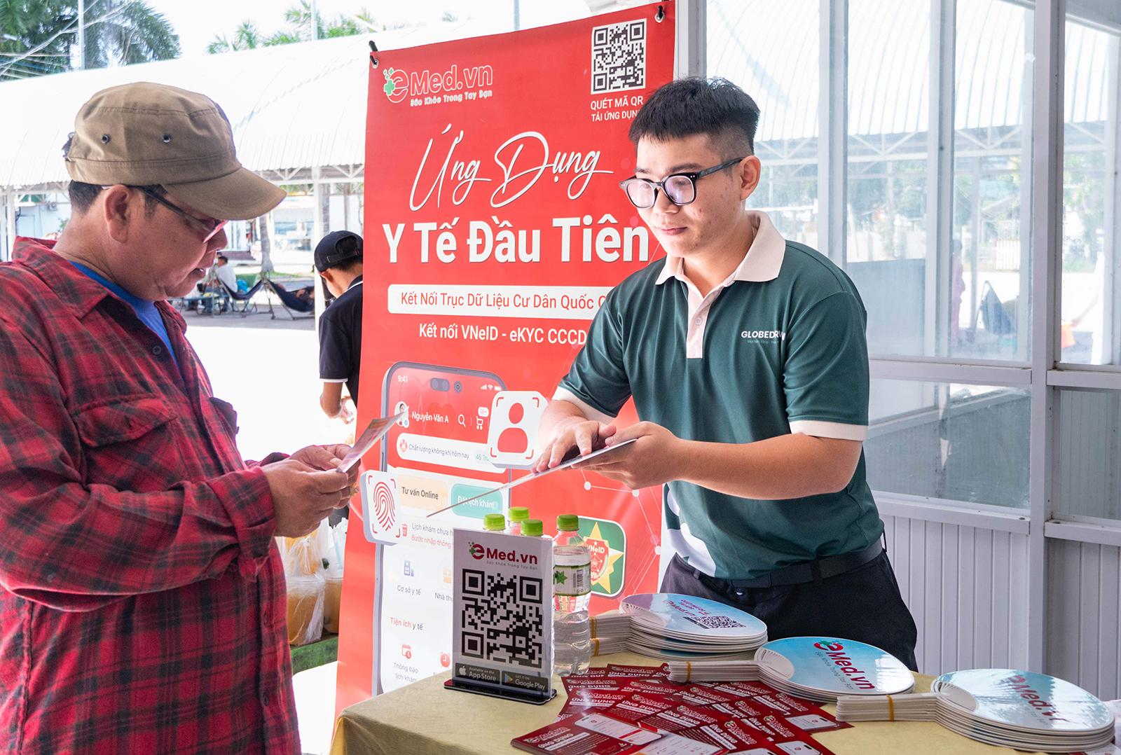 Nhân viên Công ty Cổ phần GlobeDR Việt Nam giới thiệu ứng dụng y tế eMed+ tại Bệnh viện Đa khoa Châu Đốc. Ảnh: HẠNH CHÂU