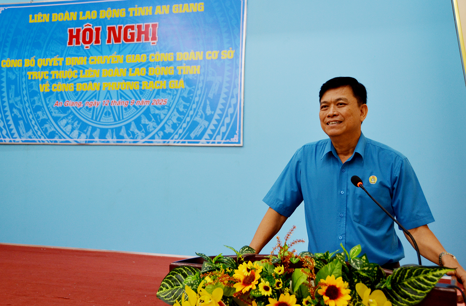 Sáng 12/9, Liên đoàn Lao động tỉnh An Giang tổ chức hội nghị công bố quyết định chuyển giao công đoàn cơ sở trực thuộc Liên đoàn Lao động tỉnh An Giang về Công đoàn phường Rạch Giá. Tỉnh ủy viên, Phó Chủ tịch UBMTTQVN tỉnh, Chủ tịch Liên đoàn Lao động tỉnh An Giang Đỗ Trần Thịnh; Phó Chủ tịch Liên đoàn Lao động tỉnh An Giang Nguyễn Nhật Tiến tham dự hội nghị.