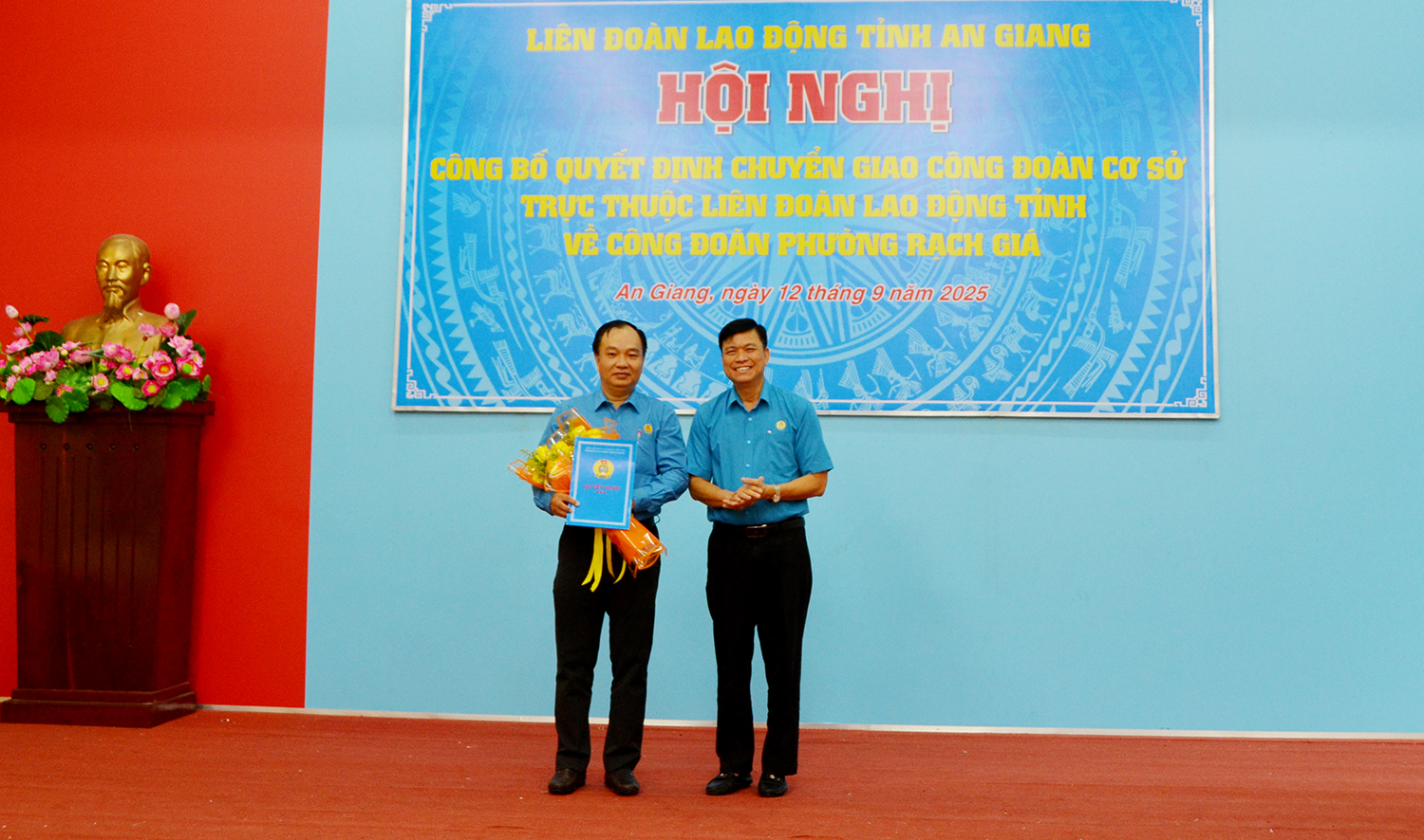 Tỉnh ủy viên, Phó Chủ tịch UBMTTQVN tỉnh, Chủ tịch Liên đoàn Lao động tỉnh An Giang Đỗ Trần Thịnh (bên phải) trao quyết định chuyển giao công đoàn cơ sở trực thuộc Liên đoàn Lao động tỉnh An Giang về Công đoàn phường Rạch Giá.