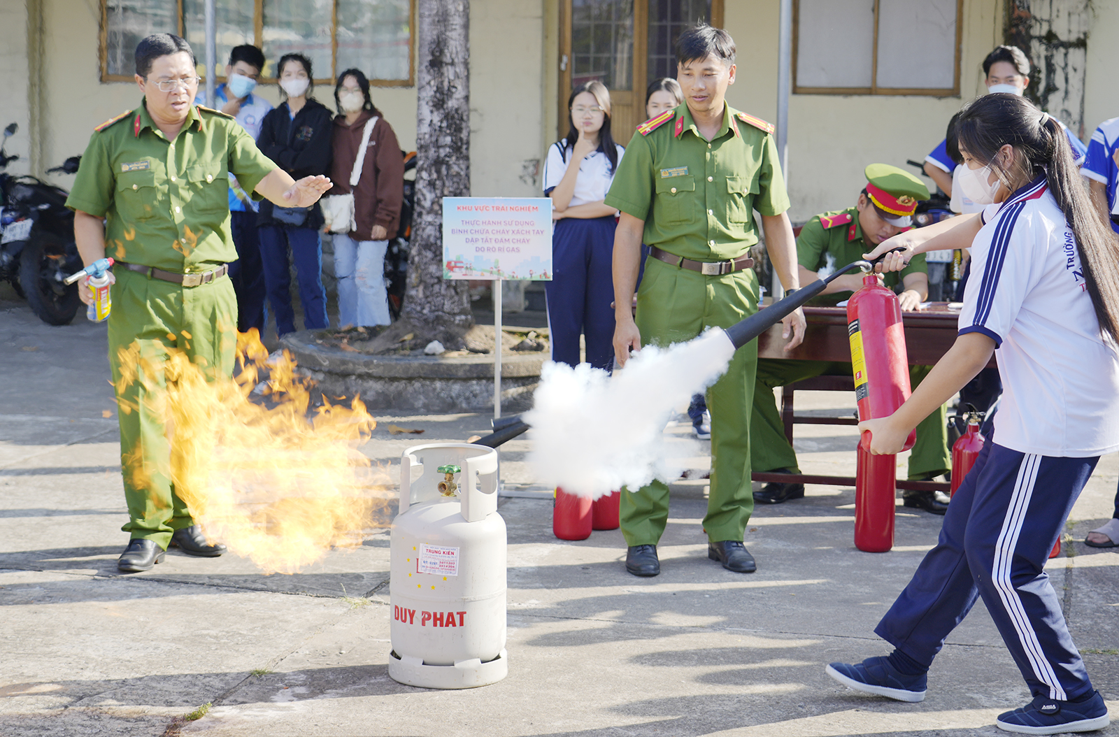 Phòng Cảnh sát phòng cháy, chữa cháy và cứu nạn, cứu hộ Công an tỉnh hướng dẫn học sinh phường Rạch Giá thực hành kỹ năng xử lý tình huống cháy, nổ, trang bị kiến thức và kỹ năng bảo vệ an toàn cho bản thân và cộng đồng. Ảnh: TÂY HỒ
