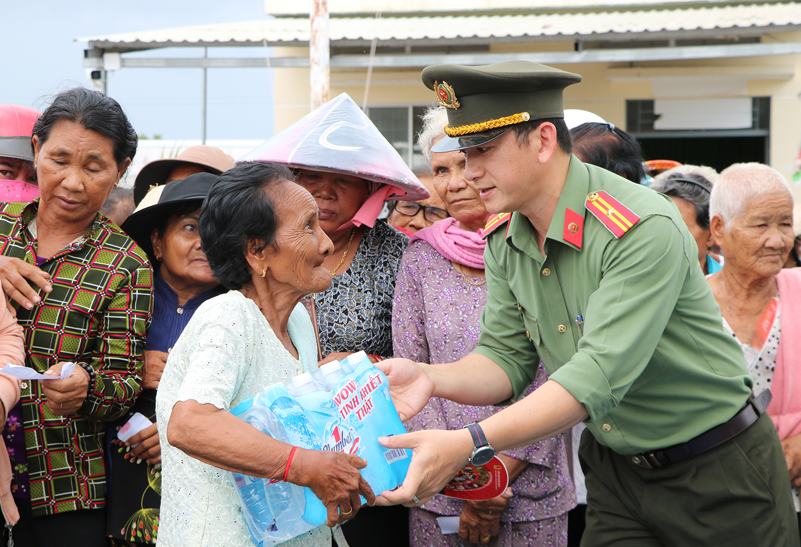 Công an tỉnh tặng nước lọc cho người dân xã Giang Thành bị ảnh hưởng mặn xâm nhập, thể hiện tinh thần sẻ chia, gắn bó với cộng đồng.