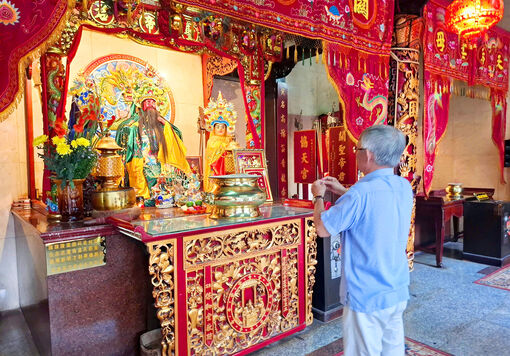 Ông Đại Quốc Dân - Phó Chủ tịch Hội Tương tế người Hoa Châu Đốc thắp hương tưởng nhớ công đức Quan Công. Ảnh: THANH TIẾN