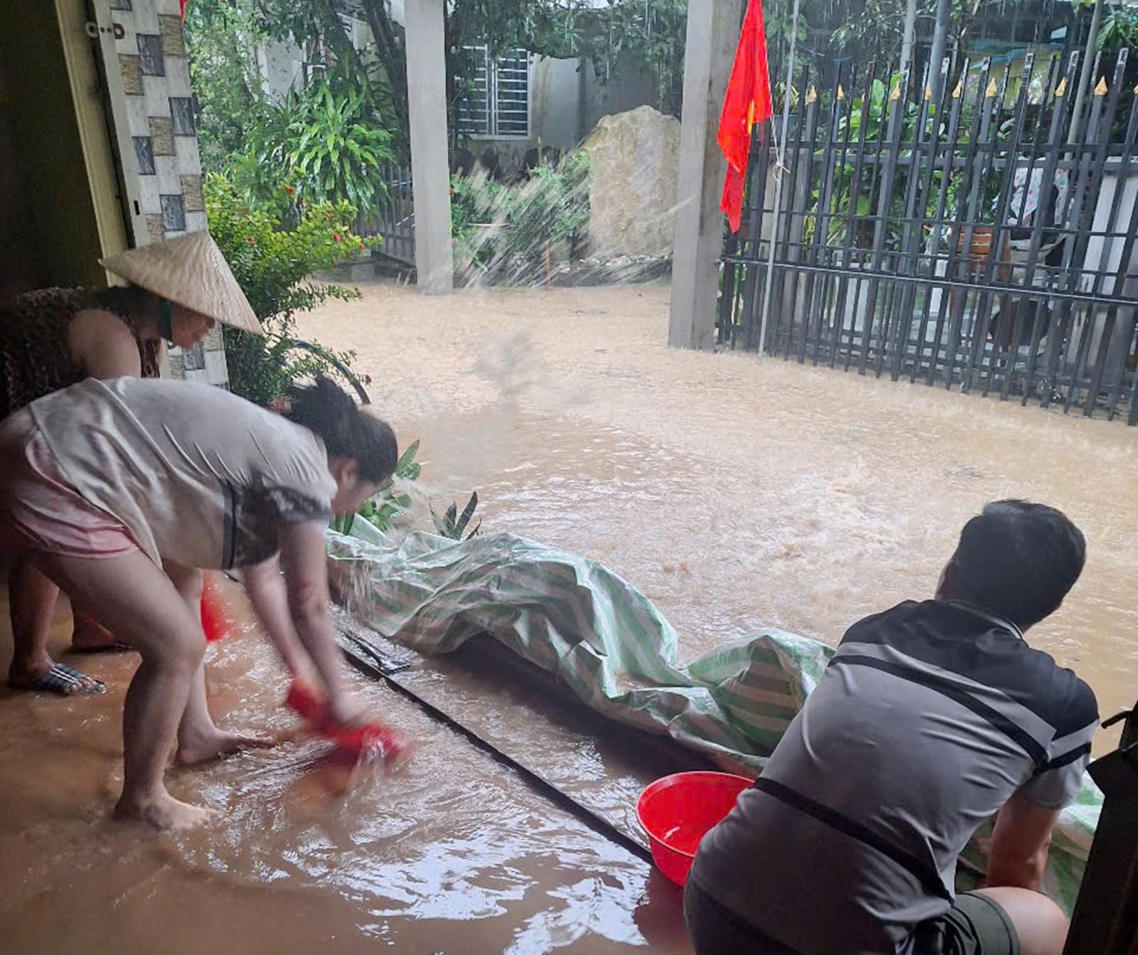 Sân nhà dân ngập sâu, nhiều người phải kê đồ đạc lên cao để tránh nước.