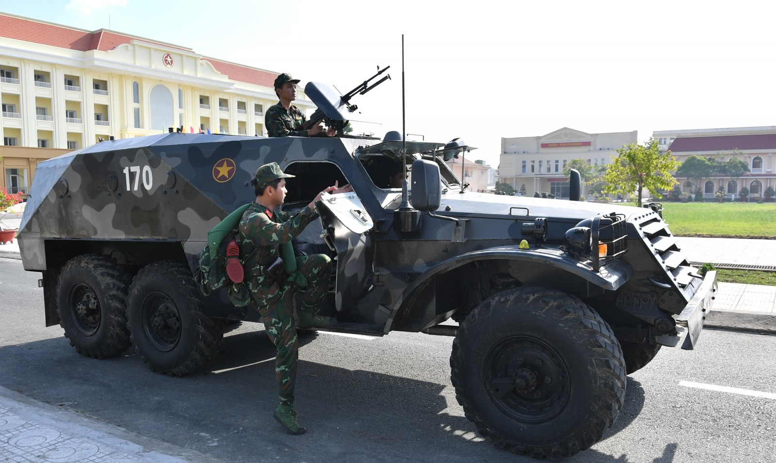Cán bộ, chiến sĩ Đại đội Trinh sát cơ giới 1, Phòng Tham mưu luyện tập cơ động lên xe thiết giáp.