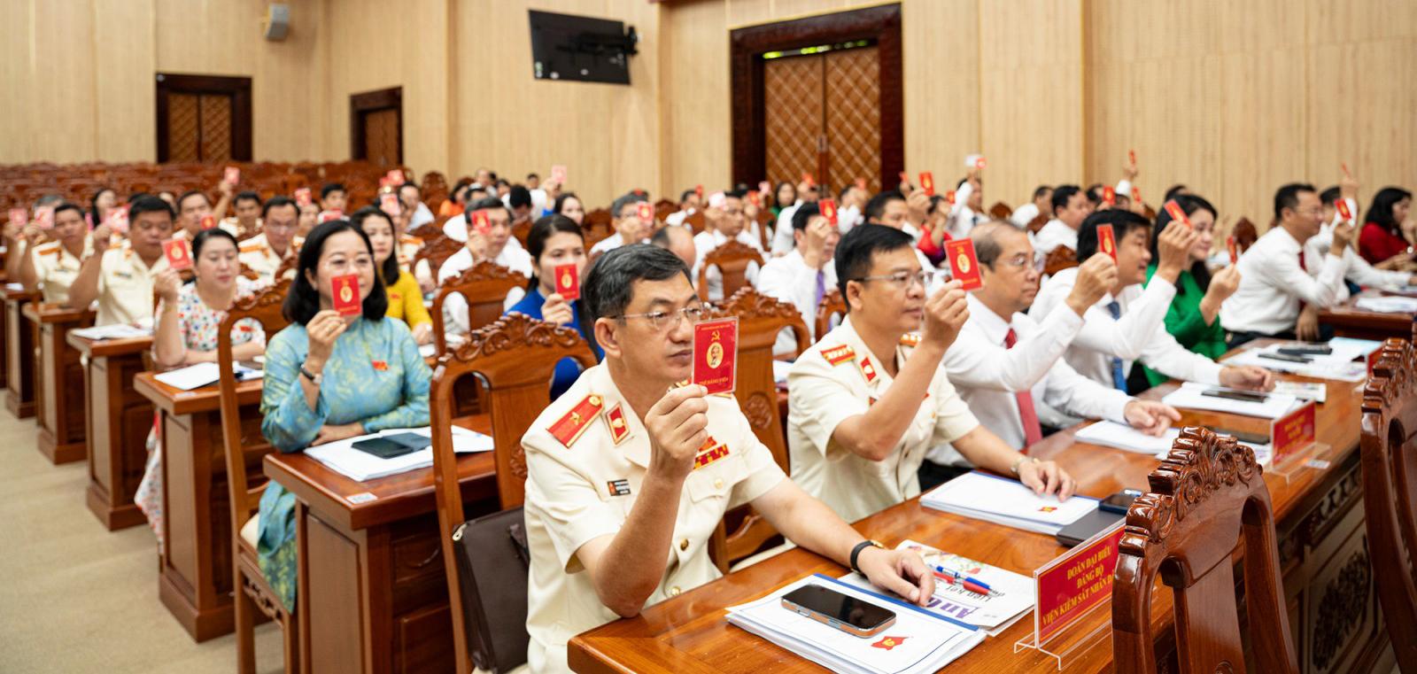 Các đại biểu biểu quyết thông qua nghị quyết Đại hội đại biểu Đảng bộ Các cơ quan Đảng tỉnh An Giang nhiệm kỳ 2025 - 2030.