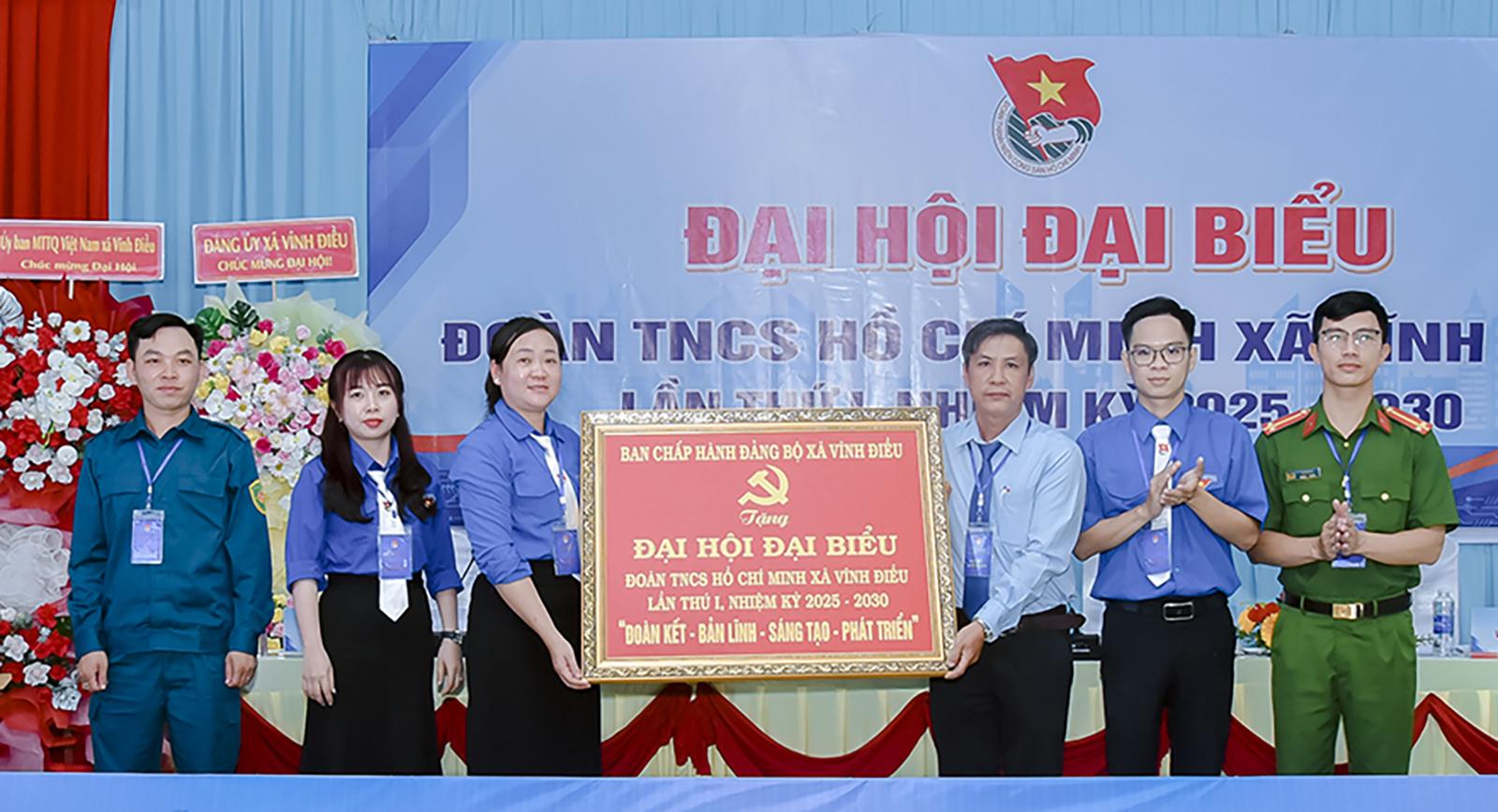 Phó Bí thư Thường trực Đảng ủy, Chủ tịch HĐND xã Vĩnh Điều Huỳnh Thiện Khoa (thứ ba, từ phải qua) trao tặng bức trướng cho đại hội.