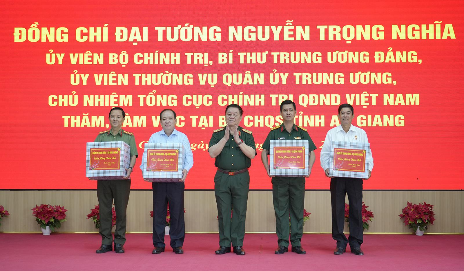 Đại tướng Nguyễn Trọng Nghĩa, Ủy viên Bộ Chính trị, Bí thư Trung ương Đảng, Ủy viên Thường vụ Quân ủy Trung ương, Chủ nhiệm Tổng cục Chính trị Quân đội nhân dân Việt Nam tặng quà Tỉnh ủy, HĐND, UBND tỉnh An Giang và các tập thể của tỉnh An Giang.