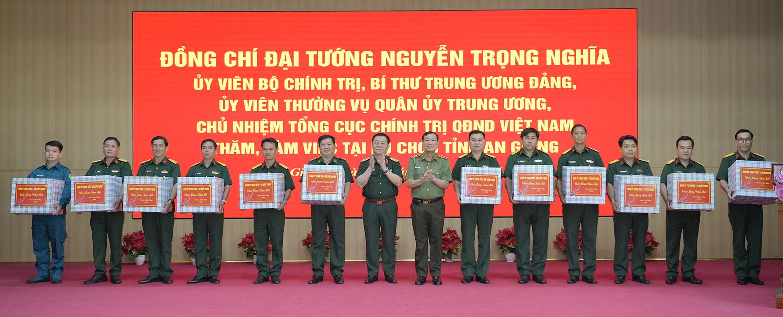 Đại tướng Nguyễn Trọng Nghĩa, Ủy viên Bộ Chính trị, Bí thư Trung ương Đảng, Ủy viên Thường vụ Quân ủy Trung ương, Chủ nhiệm Tổng cục Chính trị Quân đội nhân dân Việt Nam và Ủy viên Ban Chấp hành Trung ương Đảng, Bí thư Tỉnh ủy An Giang Nguyễn Tiến Hải tặng quà các cá nhân.