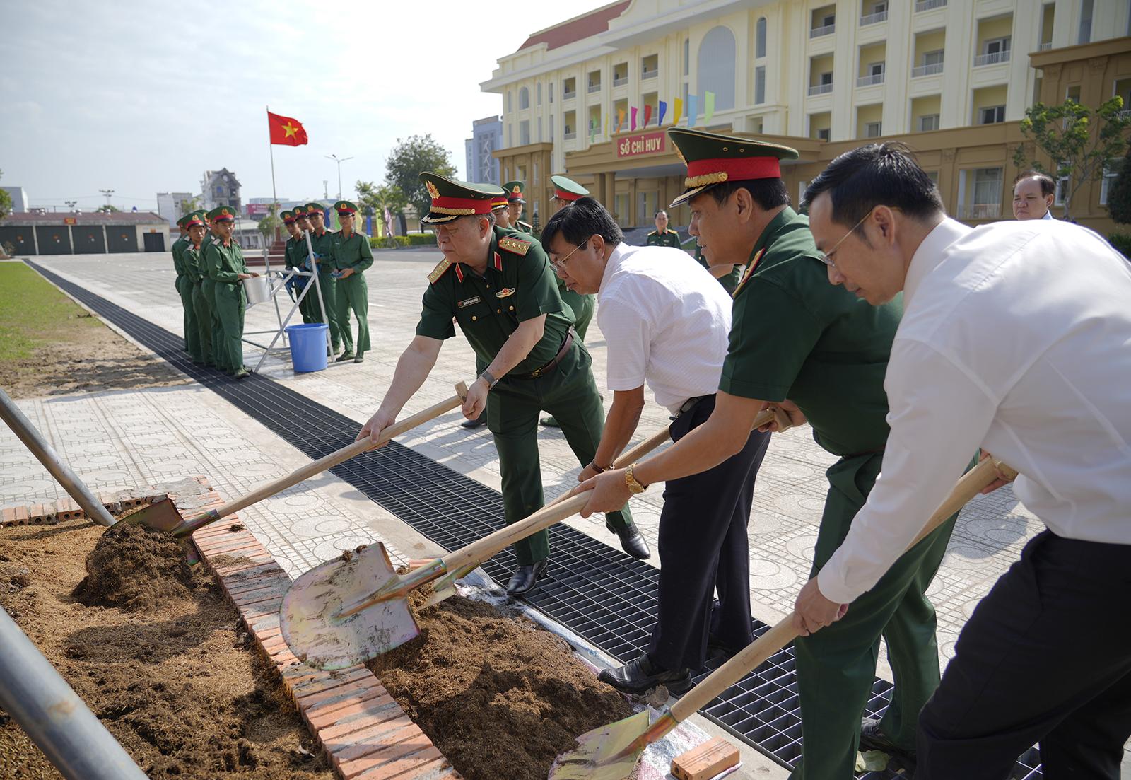 Đại tướng Nguyễn Trọng Nghĩa, Ủy viên Bộ Chính trị, Bí thư Trung ương Đảng, Ủy viên Thường vụ Quân ủy Trung ương, Chủ nhiệm Tổng cục Chính trị Quân đội nhân dân Việt Nam và các đồng chí lãnh đạo trồng cây lưu niệm tại Bộ Chỉ huy Quân sự tỉnh An Giang.