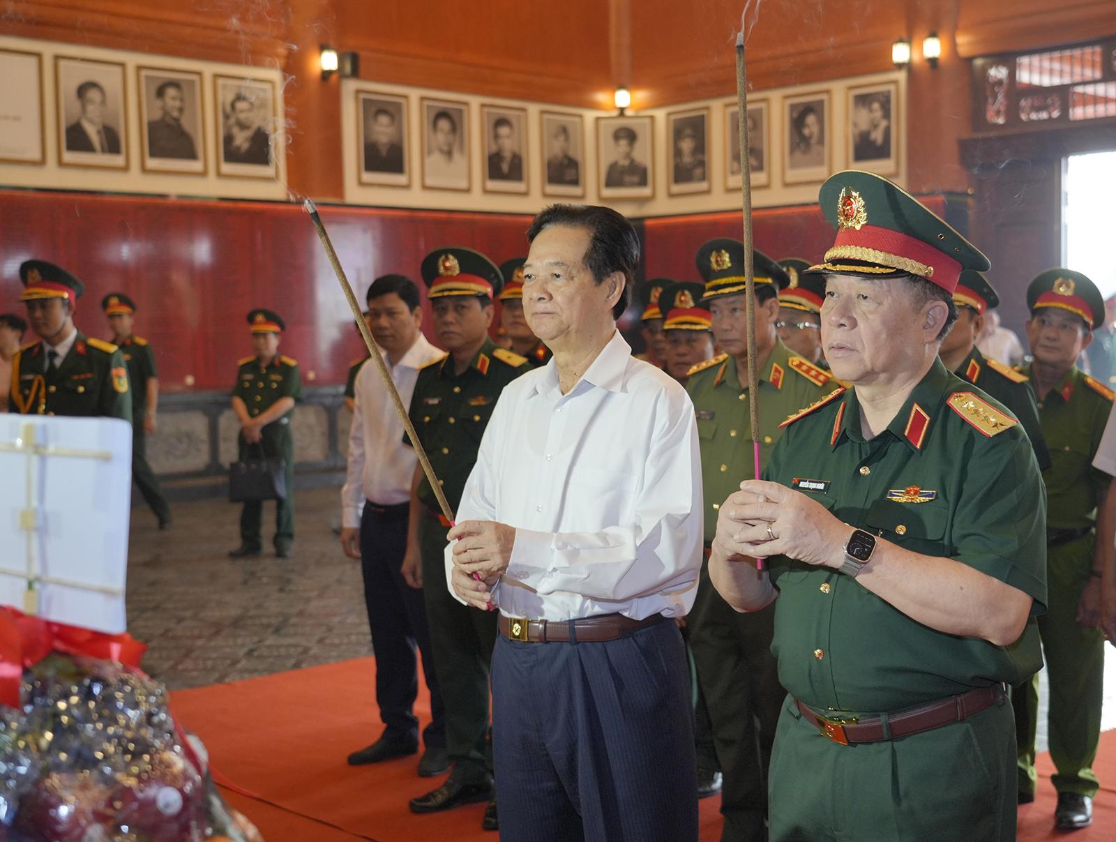 Đồng chí Nguyễn Tấn Dũng, nguyên Ủy viên Bộ Chính trị, nguyên Thủ tướng Chính phủ và Đại tướng Nguyễn Trọng Nghĩa, Ủy viên Bộ Chính trị, Bí thư Trung ương Đảng, Ủy viên Thường vụ Quân ủy Trung ương, Chủ nhiệm Tổng cục Chính trị Quân đội nhân dân Việt Nam dâng hương tại Đền tưởng niệm Anh hùng liệt sĩ và người có công.