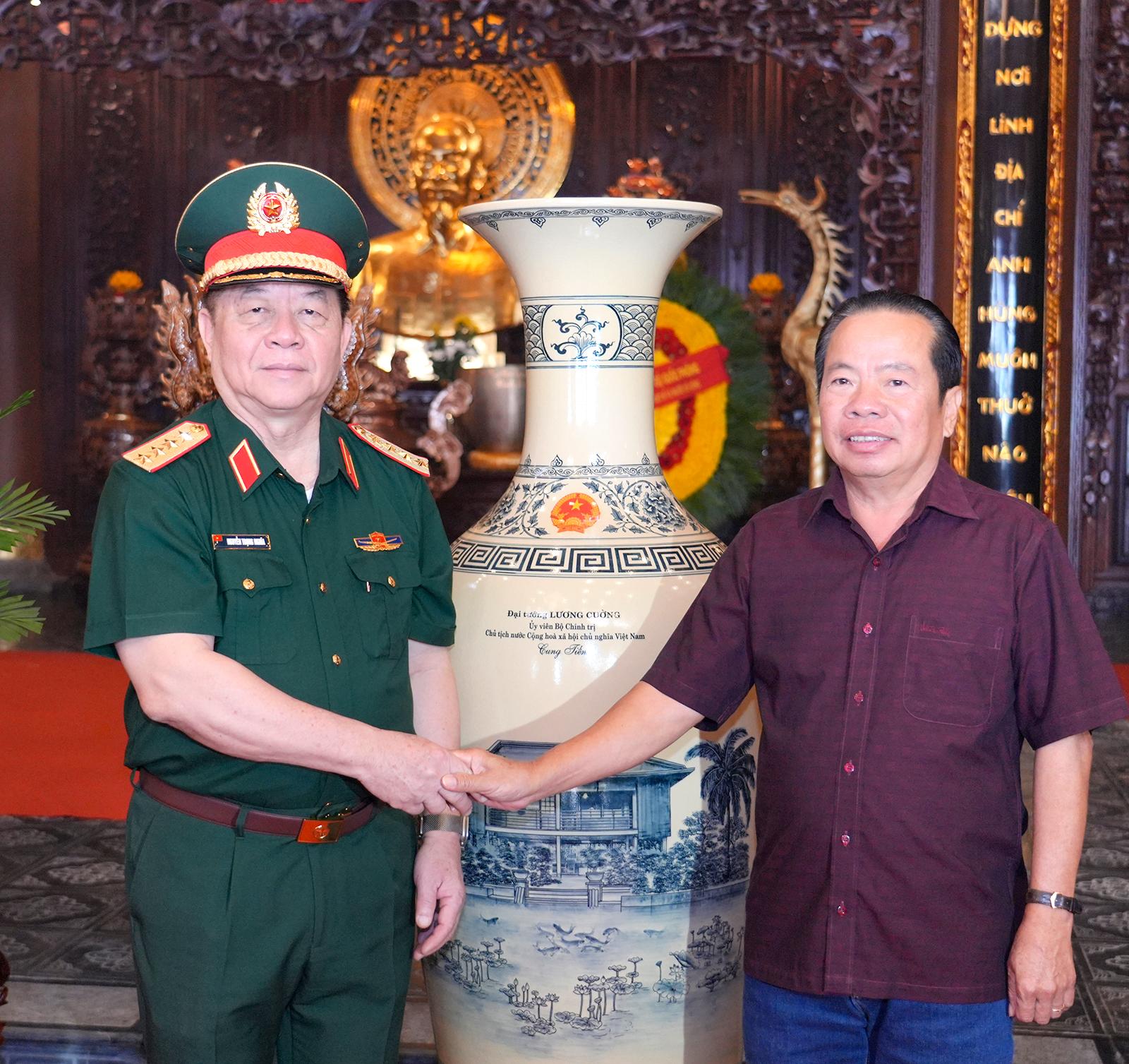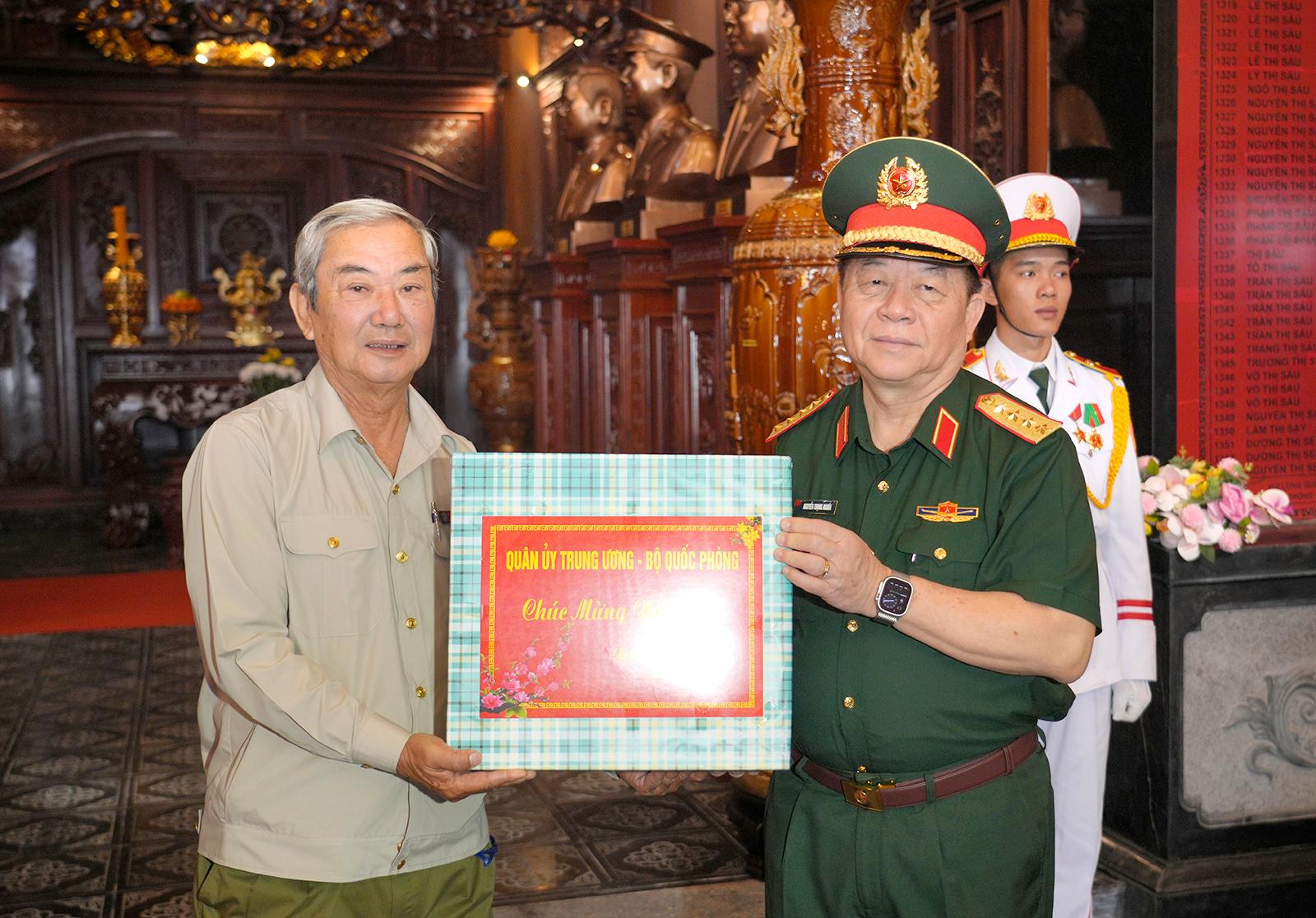 Đại tướng Nguyễn Trọng Nghĩa, Ủy viên Bộ Chính trị, Bí thư Trung ương Đảng, Ủy viên Thường vụ Quân ủy Trung ương, Chủ nhiệm Tổng cục Chính trị Quân đội nhân dân Việt Nam trao quà cho Ban Quản trị Đền tưởng niệm Anh hùng liệt sĩ và người có công.