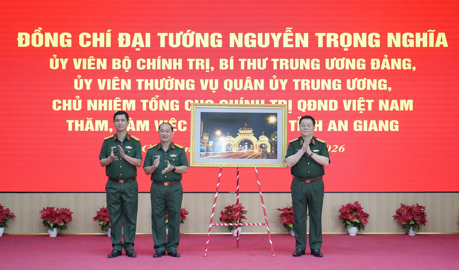 Bộ Chỉ huy Quân sự tỉnh An Giang trao quà tặng Đại tướng Nguyễn Trọng Nghĩa, Ủy viên Bộ Chính trị, Bí thư Trung ương Đảng, Ủy viên Thường vụ Quân ủy Trung ương, Chủ nhiệm Tổng cục Chính trị Quân đội nhân dân Việt Nam.