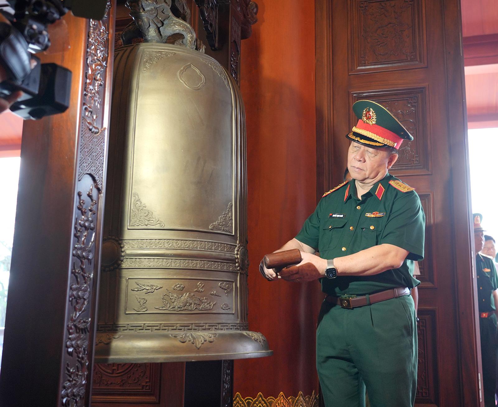 Đại tướng Nguyễn Trọng Nghĩa, Ủy viên Bộ Chính trị, Bí thư Trung ương Đảng, Ủy viên Thường vụ Quân ủy Trung ương, Chủ nhiệm Tổng cục Chính trị Quân đội nhân dân Việt Nam khai chuông tại Đền tưởng niệm Anh hùng liệt sĩ và người có công.