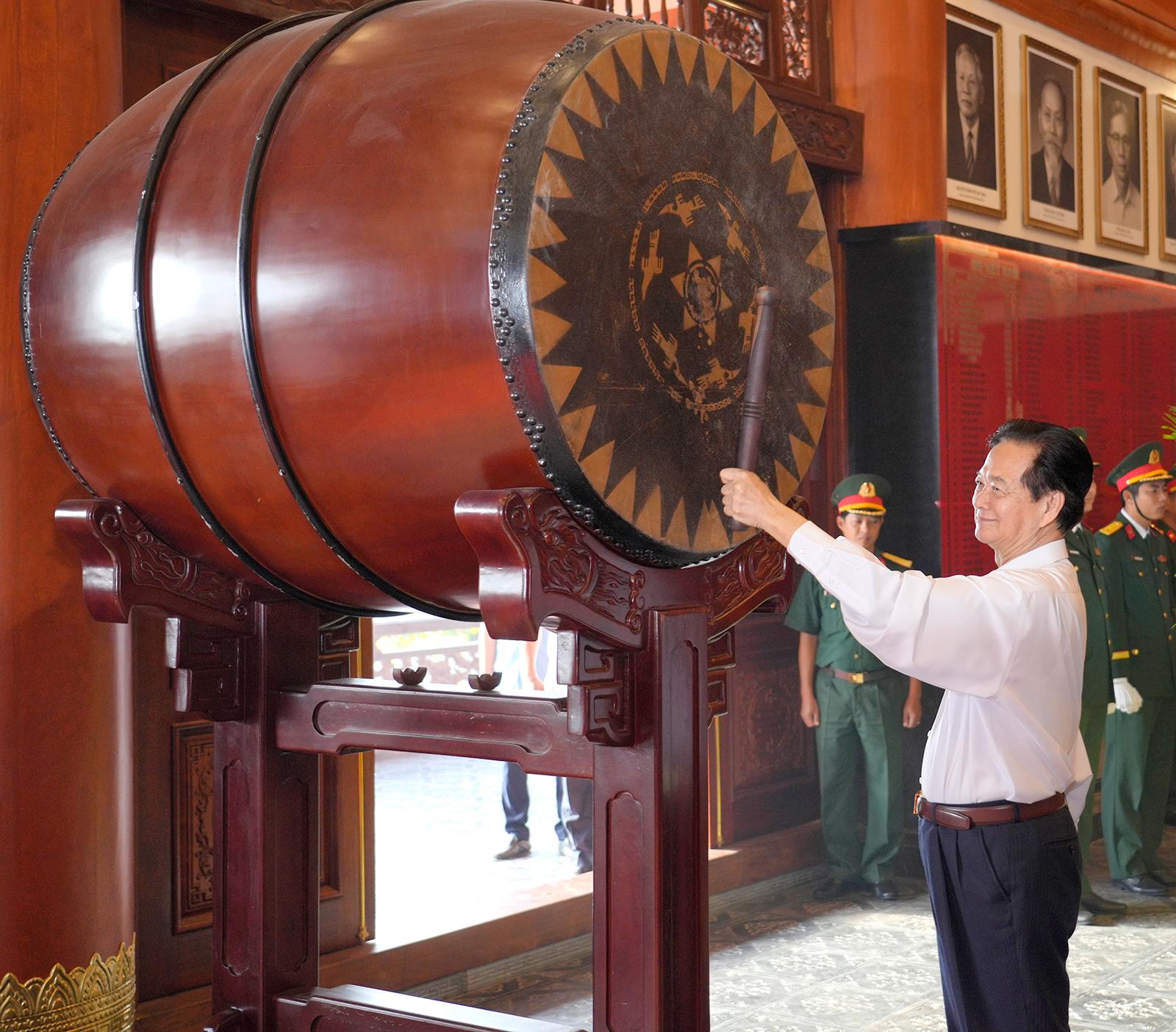Đồng chí Nguyễn Tấn Dũng, nguyên Ủy viên Bộ Chính trị, nguyên Thủ tướng Chính phủ khai trống tại Đền tưởng niệm Anh hùng liệt sĩ và người có công.