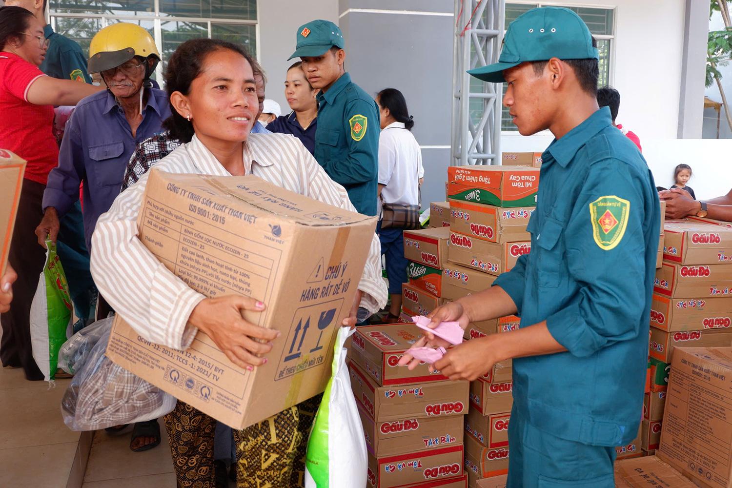 Người dân xã Phú Lợi, nay là xã Giang Thành được tặng quà từ chương trình Tết quân - dân năm 2025. Ảnh: THU OANH