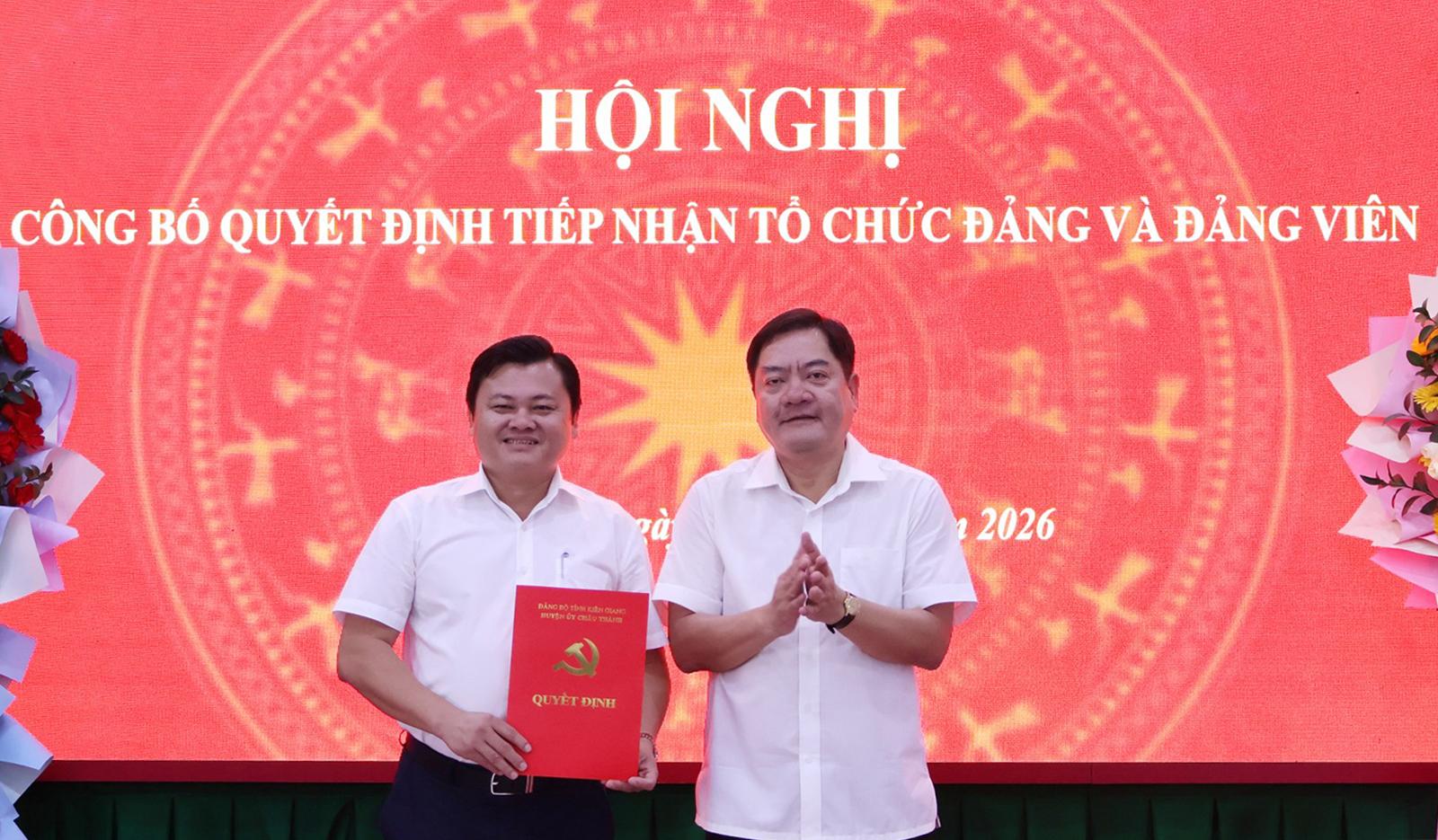 Đồng chí Lâm Minh Công, Bí thư Đảng ủy xã Châu Thành trao quyết định tiếp nhận tổ chức Đảng và đảng viên cho đồng chí Phạm Minh Tấn.