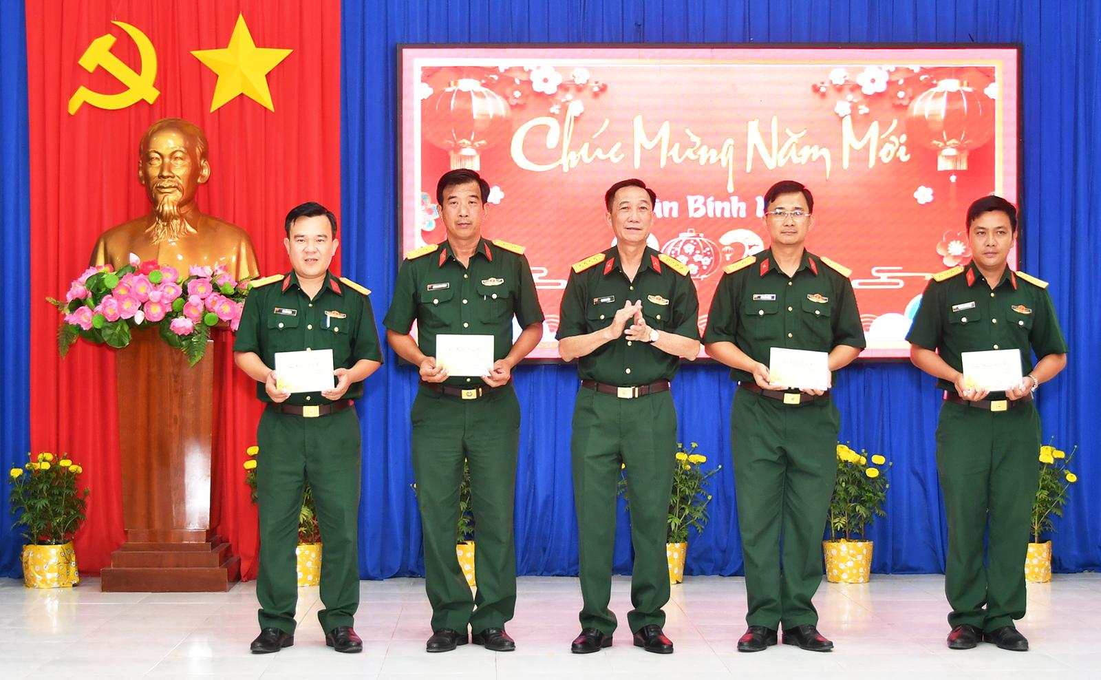 Đại tá Cao Minh Tâm, Phó Chính ủy Bộ Chỉ huy Quân sự tỉnh An Giang trao tặng quà tết cho Ban Chỉ huy Quân sự các xã, phường.