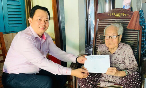 Bí thư Đảng ủy, Chủ tịch HĐND xã Cù Lao Giêng Võ Minh Nâng thăm, tặng quà Mẹ Việt Nam Anh hùng Lê Thị Sáu.