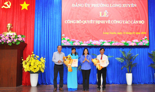 Bí thư Đảng ủy phường Long Xuyên Lâm Quang Thi và Phó Bí thư Thường trực Đảng ủy phường Võ Thị Xuân Kiều trao quyết định, tặng hoa chúc mừng 2 cán bộ được bổ nhiệm.