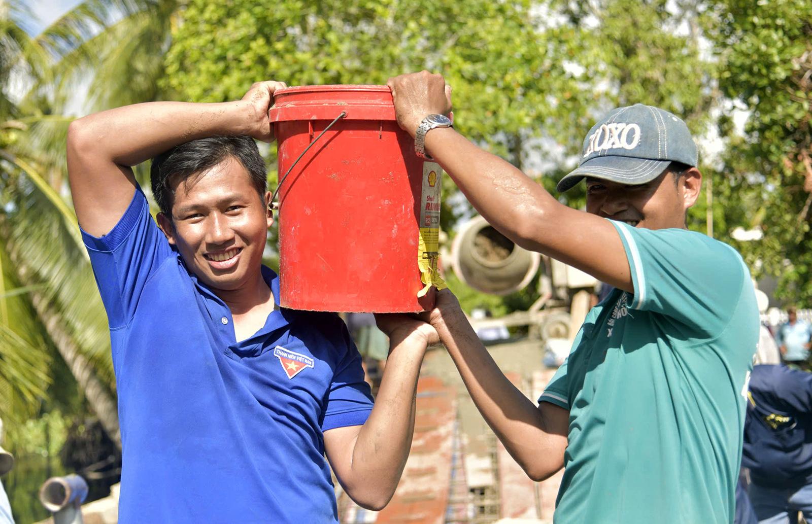 Anh Danh Huỳnh (bên phải) vận chuyển cát, đá xây dựng cầu giao thông nông thôn cho người dân. Ảnh: AN LÂM