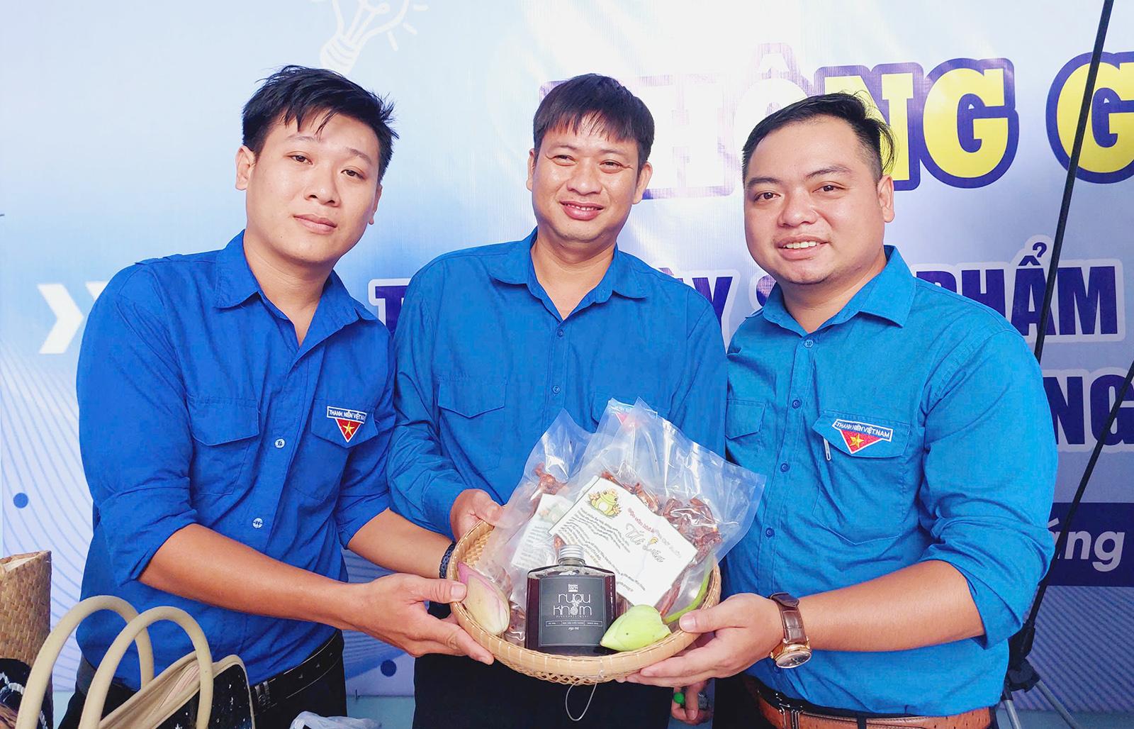 Anh Phùng Văn Thẩm (bìa trái) dự thi sản phẩm khô ếch tại cuộc thi khởi nghiệp, đổi mới sáng tạo do Tỉnh đoàn tổ chức. Ảnh: AN LÂM