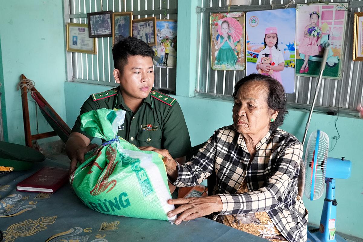 Trung úy Danh Gia Tính (bên trái) thăm, tặng quà hộ nghèo trong chương trình “Hũ gạo tình thương”