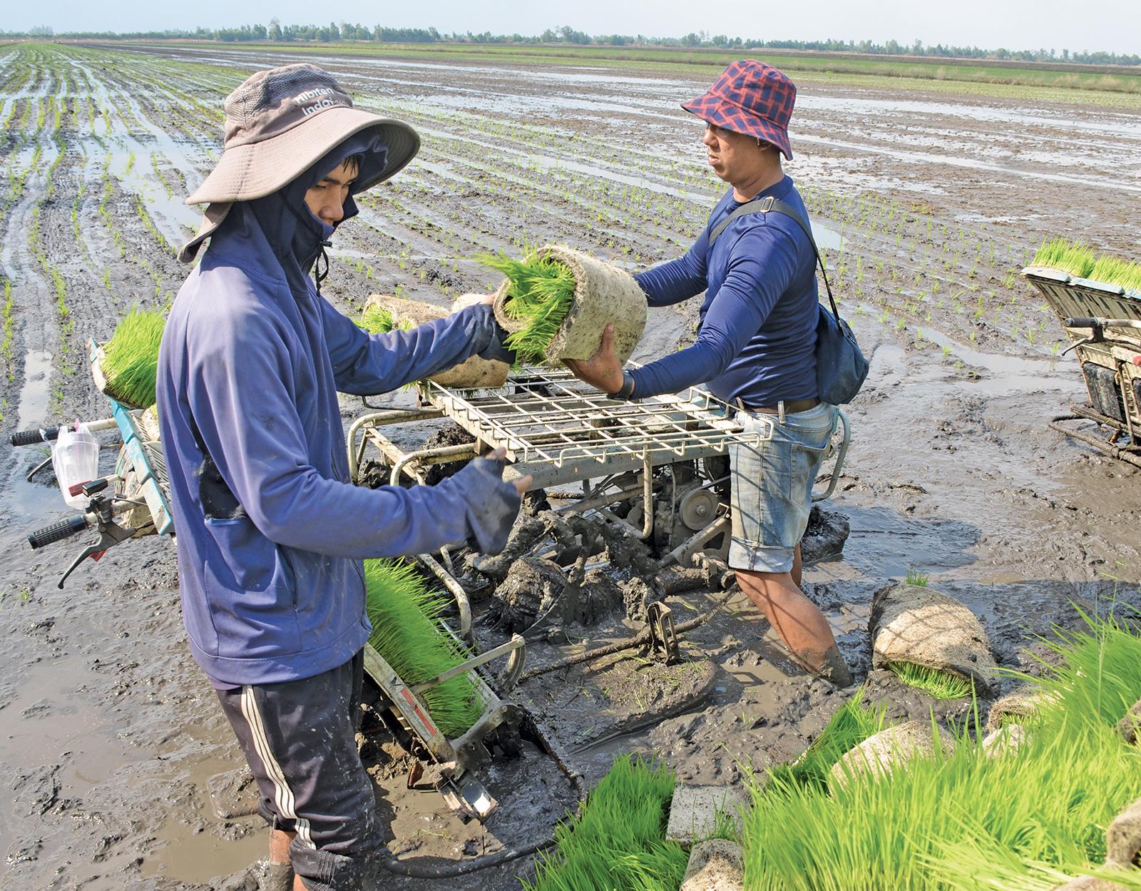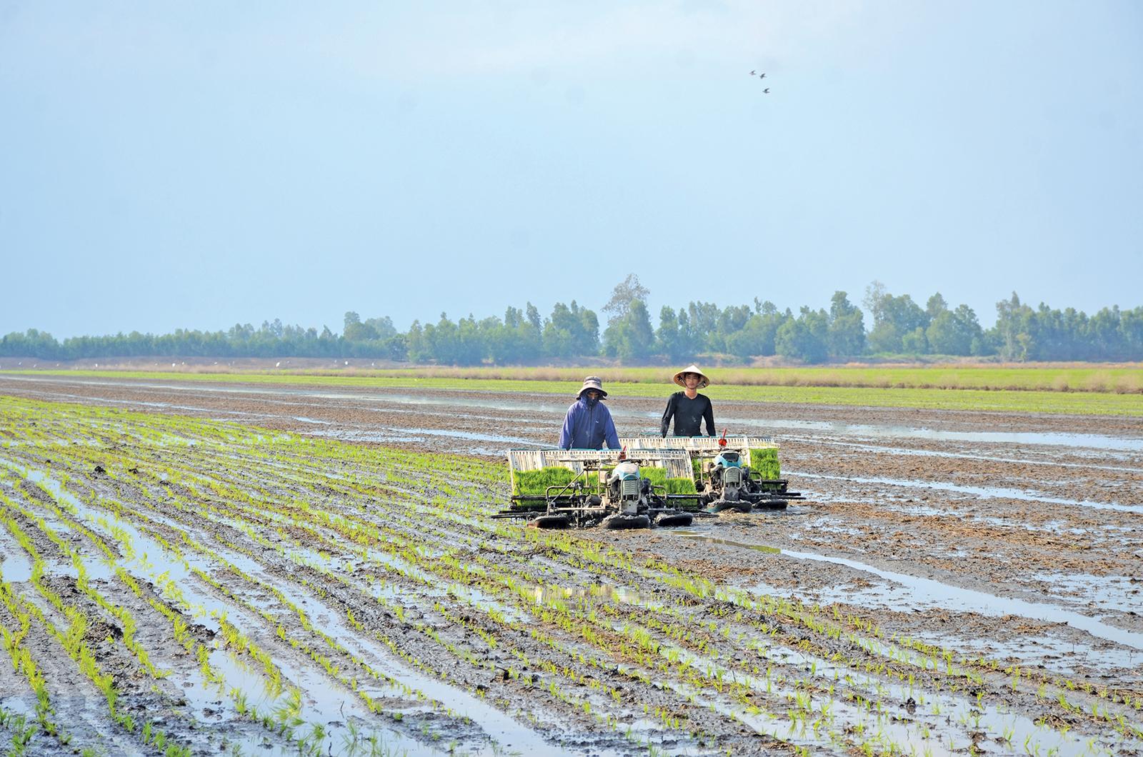 Nông dân xã Vĩnh Điều cấy lúa bằng máy.