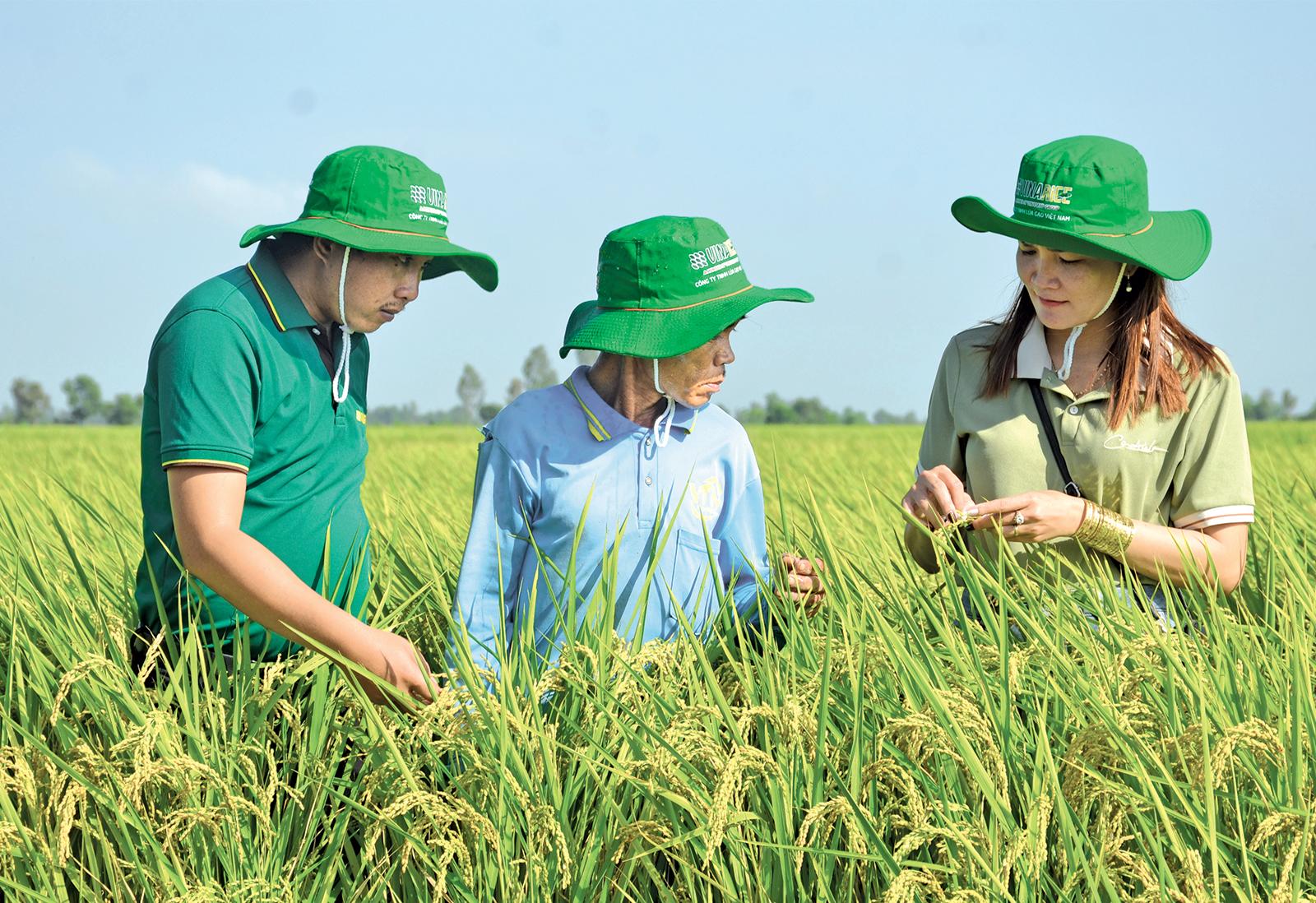 Chúng tôi đến thăm Hợp tác xã Nông nghiệp Tân Thuận, xã Mỹ Thuận vào đúng dịp hợp tác xã tổ chức hội thảo đầu bờ về thực hiện mô hình trồng lúa chất lượng cao, phát thải thấp thuộc đề án phát triển bền vững 1 triệu ha chuyên canh lúa chất lượng cao, phát thải thấp, gắn với tăng trưởng xanh vùng đồng bằng sông Cửu Long. Nông dân từ các xã lân cận cùng tham gia và thăm đồng, trao đổi kinh nghiệm sản xuất. Giám đốc Hợp tác xã Nông nghiệp Tân Thuận Nguyễn Thanh Tuấn nói: “Ngày xưa, ở đây đất phèn nặng làm ruộng năng suất thấp, 1 công chưa được chục bao lúa. Còn hiện tại, đất này làm lúa trúng lắm, năng suất vụ đông xuân từ 1 - 1,3 tấn/công, hè thu khoảng từ 900kg - 1 tấn/công. Hợp tác xã đang hợp tác với doanh nghiệp bán tín chỉ carbon từ việc trồng lúa giảm phát thải”.