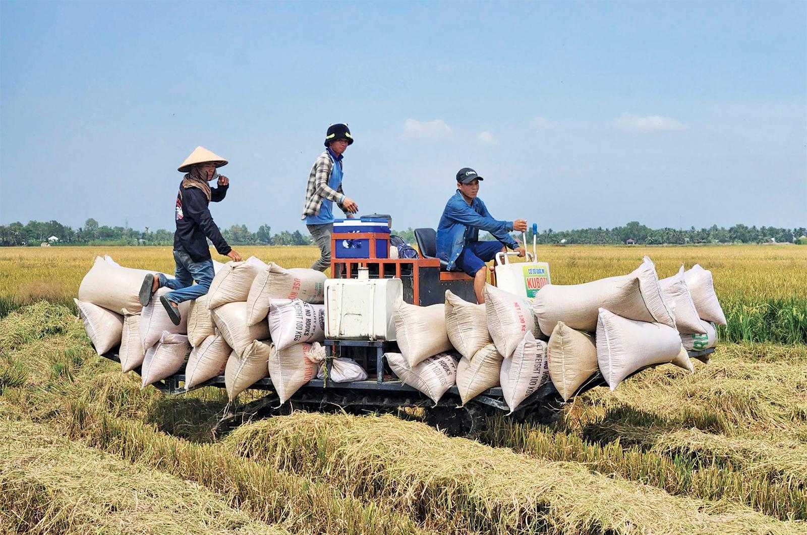 Nông dân xã Mỹ Thuận thu hoạch lúa.