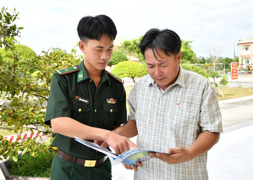 Cán bộ biên phòng phát đặc san chống khai thác IUU cho ngư dân tại xã Hòn Đất. Ảnh: THÙY TRANG