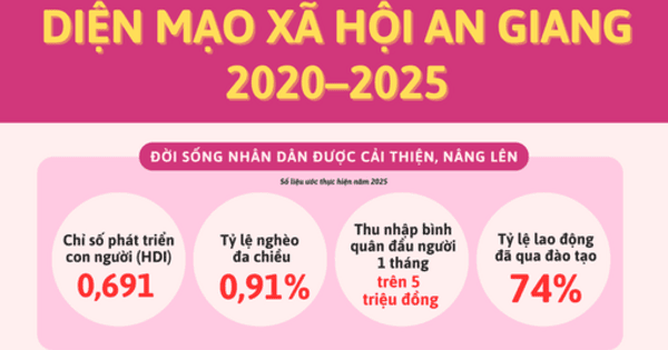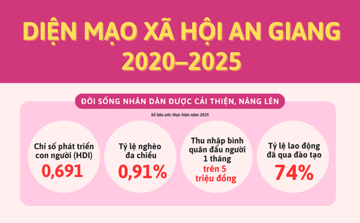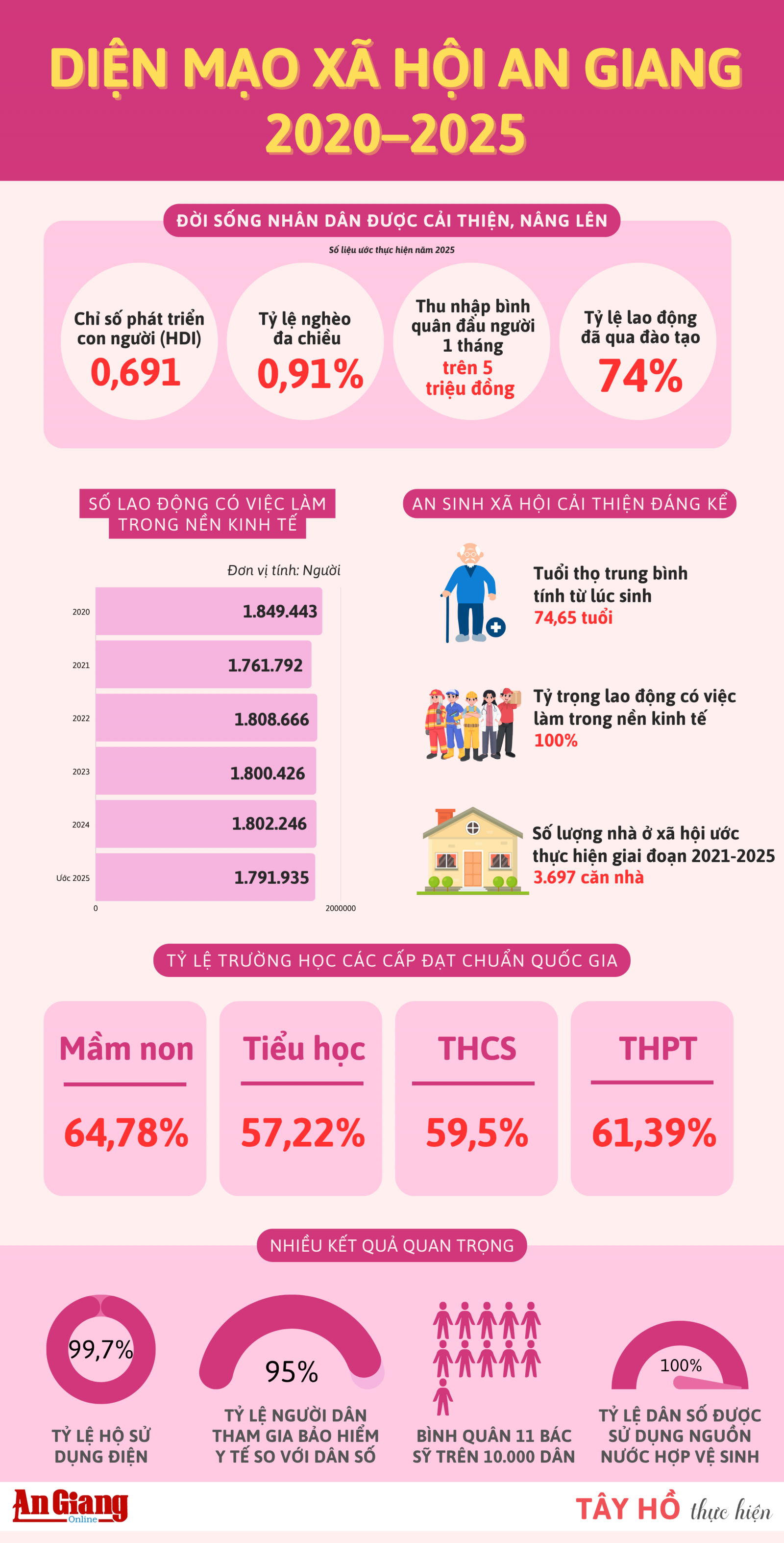 Trong giai đoạn 2020–2025, diện mạo xã hội An Giang có nhiều đổi thay rõ nét: Dân số ổn định, tỷ lệ đô thị hóa tăng nhanh; cơ cấu lao động chuyển dịch theo hướng giảm dần nông nghiệp, tăng mạnh dịch vụ; tuổi thọ trung bình và chỉ số phát triển con người (HDI) đều được cải thiện. Các lĩnh vực giáo dục, y tế, phúc lợi xã hội cũng ghi dấu những bước tiến vững chắc, với tỷ lệ trường đạt chuẩn quốc gia tăng đều, bảo hiểm y tế bao phủ rộng, thu nhập bình quân đầu người nâng cao và tỷ lệ nghèo đa chiều giảm còn 0,91%. Những kết quả này phản ánh nỗ lực bền bỉ của cả hệ thống chính trị và người dân trong việc nâng cao chất lượng cuộc sống.