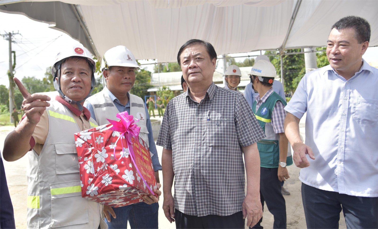 Phó Chủ tịch Quốc hội Lê Minh Hoan tặng quà động viên kỹ sư, công nhân, nhà thầu đang thi công dự án đường Hồ Chí Minh tại xã Gò Quao.