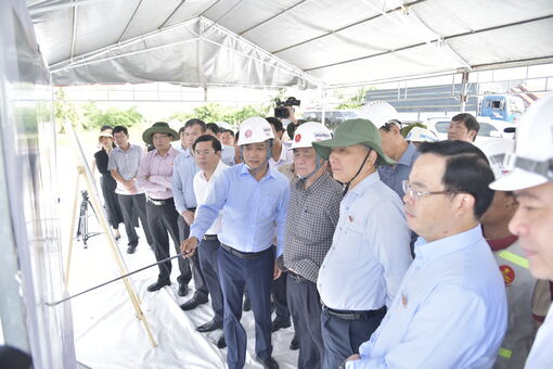 Phó Chủ tịch Quốc hội Lê Minh Hoan động viên đội ngũ kỹ sư, công nhân, nhà thầu đang thi công dự án đường Hồ Chí Minh tại xã Vĩnh Tuy.