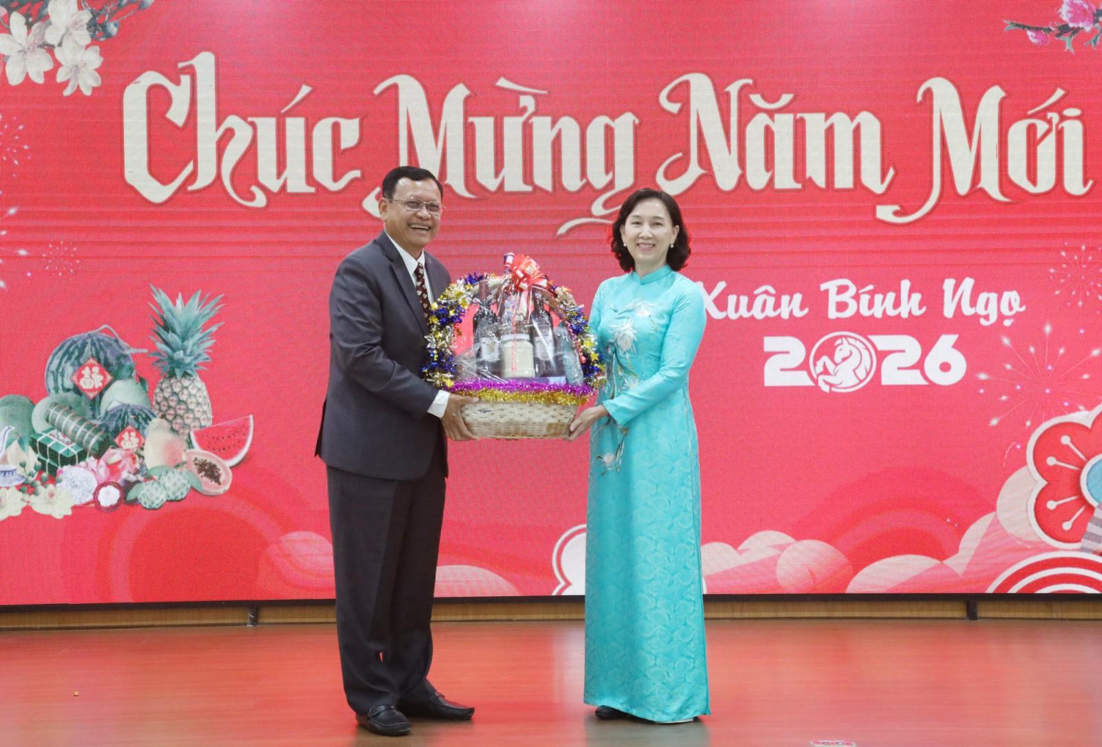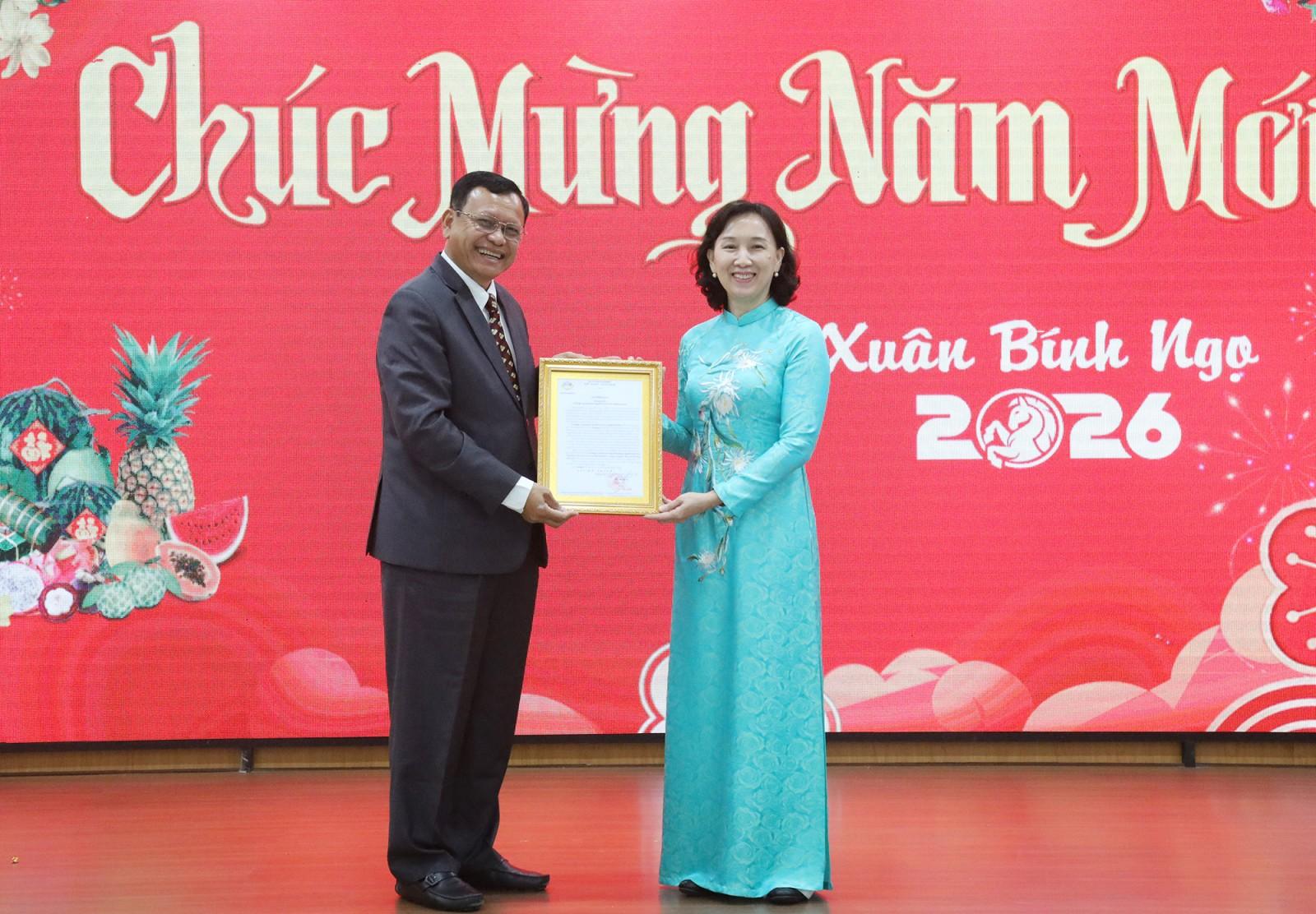 Ông Khiev Rithiphorn, Phó Tỉnh trưởng tỉnh Kampot trao thư chúc tết cho Phó Chủ tịch UBND tỉnh Nguyễn Thị Minh Thúy.