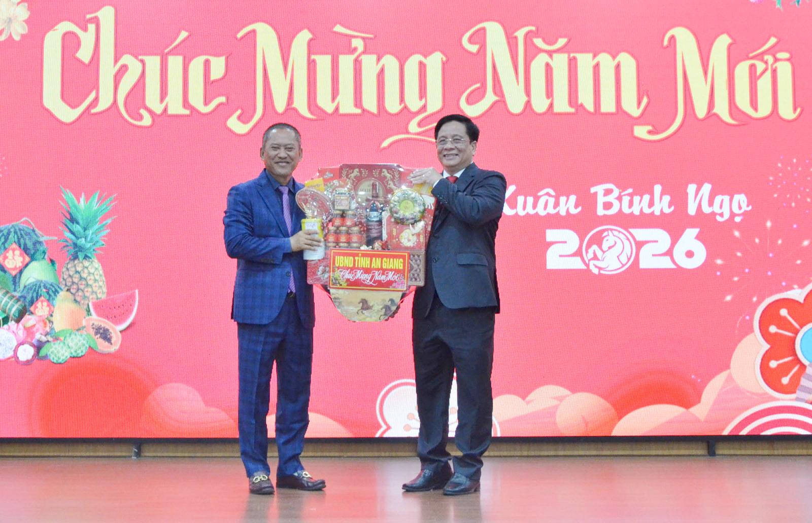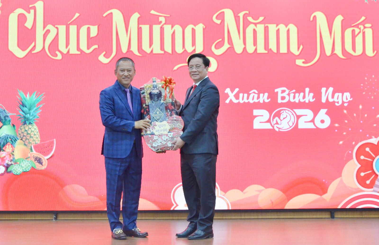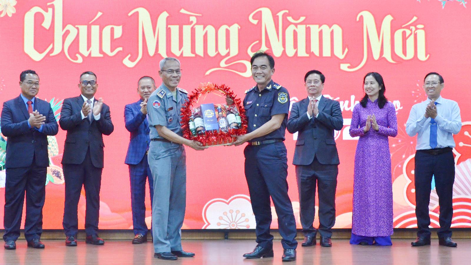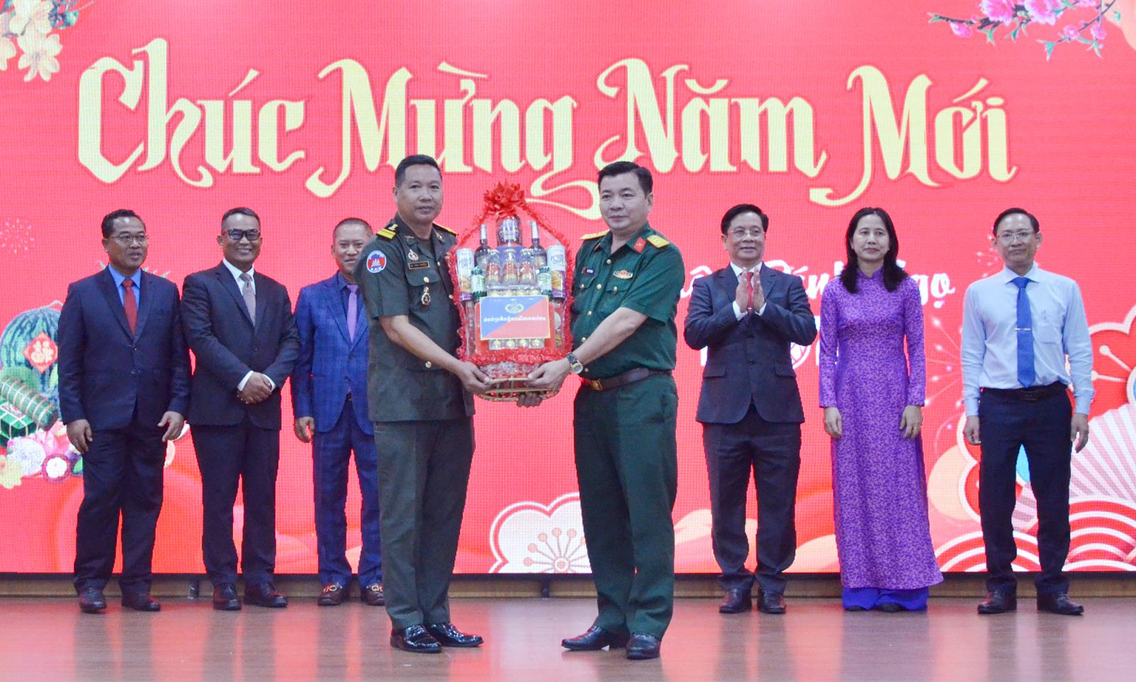 Lãnh đạo tỉnh Takeo (bên trái) chúc tết, tặng quà lãnh đạo UBND tỉnh An Giang.