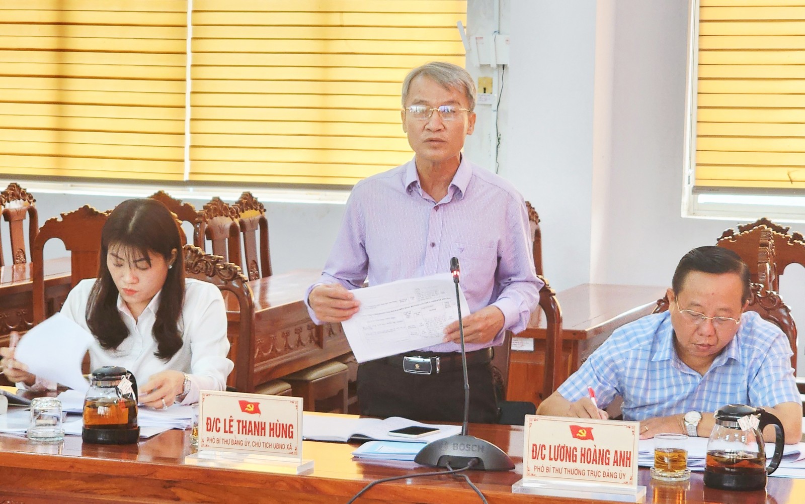 Phó Bí thư Đảng ủy, Chủ tịch UBND xã Tân Hiệp Lê Thanh Hùng báo cáo tại buổi làm việc. Ảnh: TRẦN HIẾU