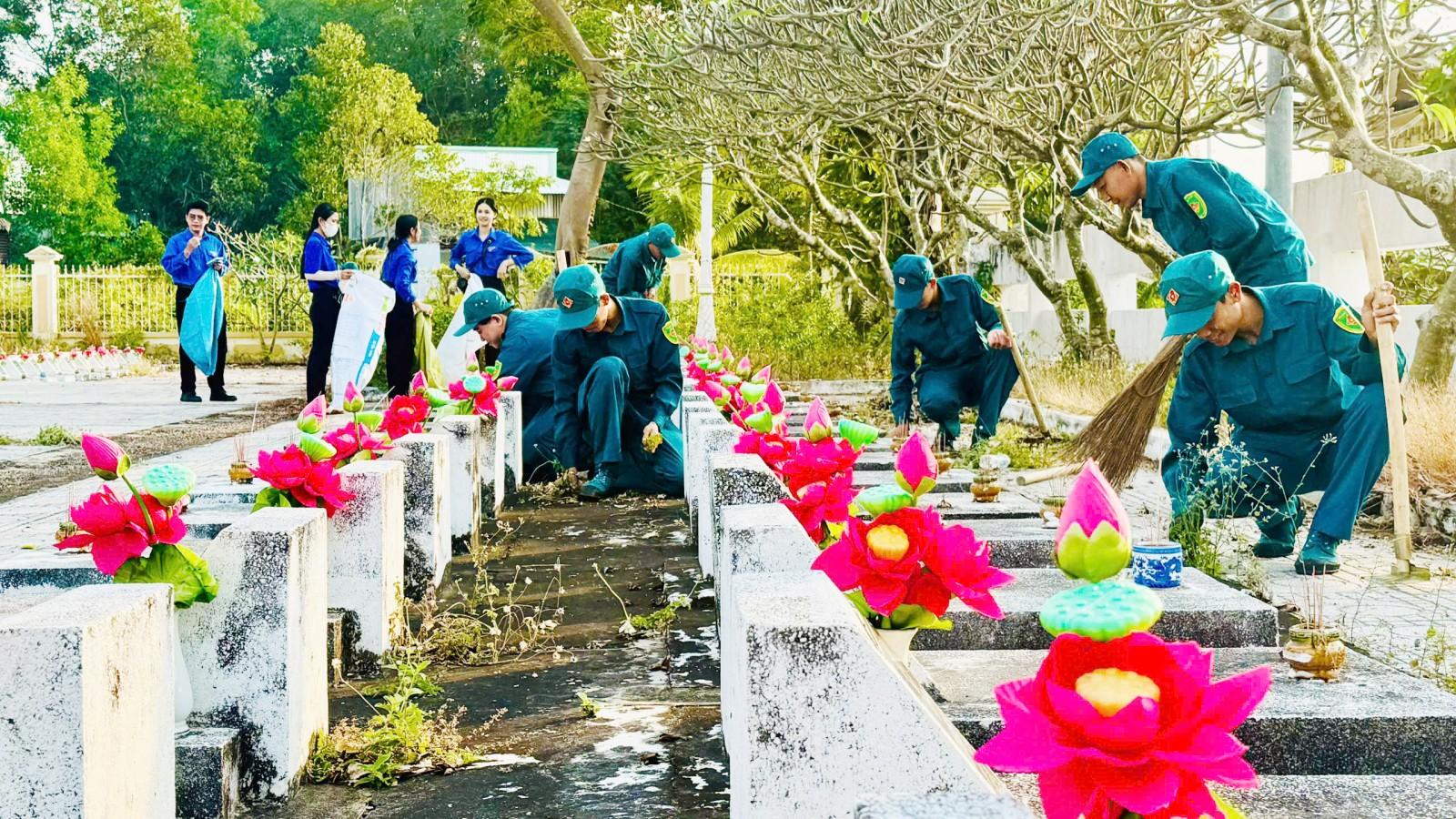 Đoàn viên, thanh niên và lực lượng vũ trang tham gia chỉnh trang Nghĩa trang liệt sĩ Hà Tiên.